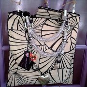 Sacoche réalisée en tissus légèrement satiné noir et argent, entièrement doublée. Fermeture par attache métallique argentée, entièrement doublée en tissus PVC gris foncé. Poignée en cuir noir.