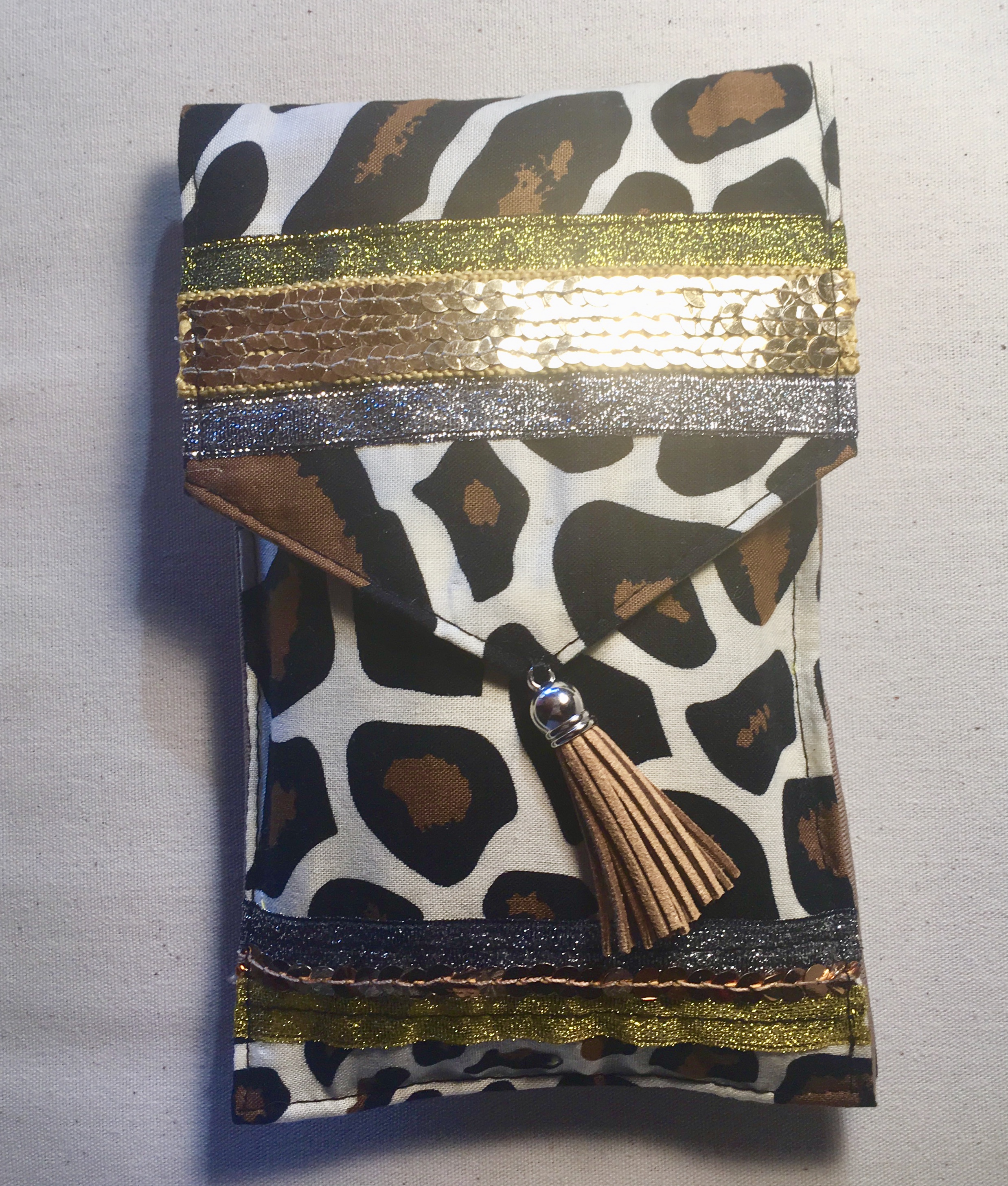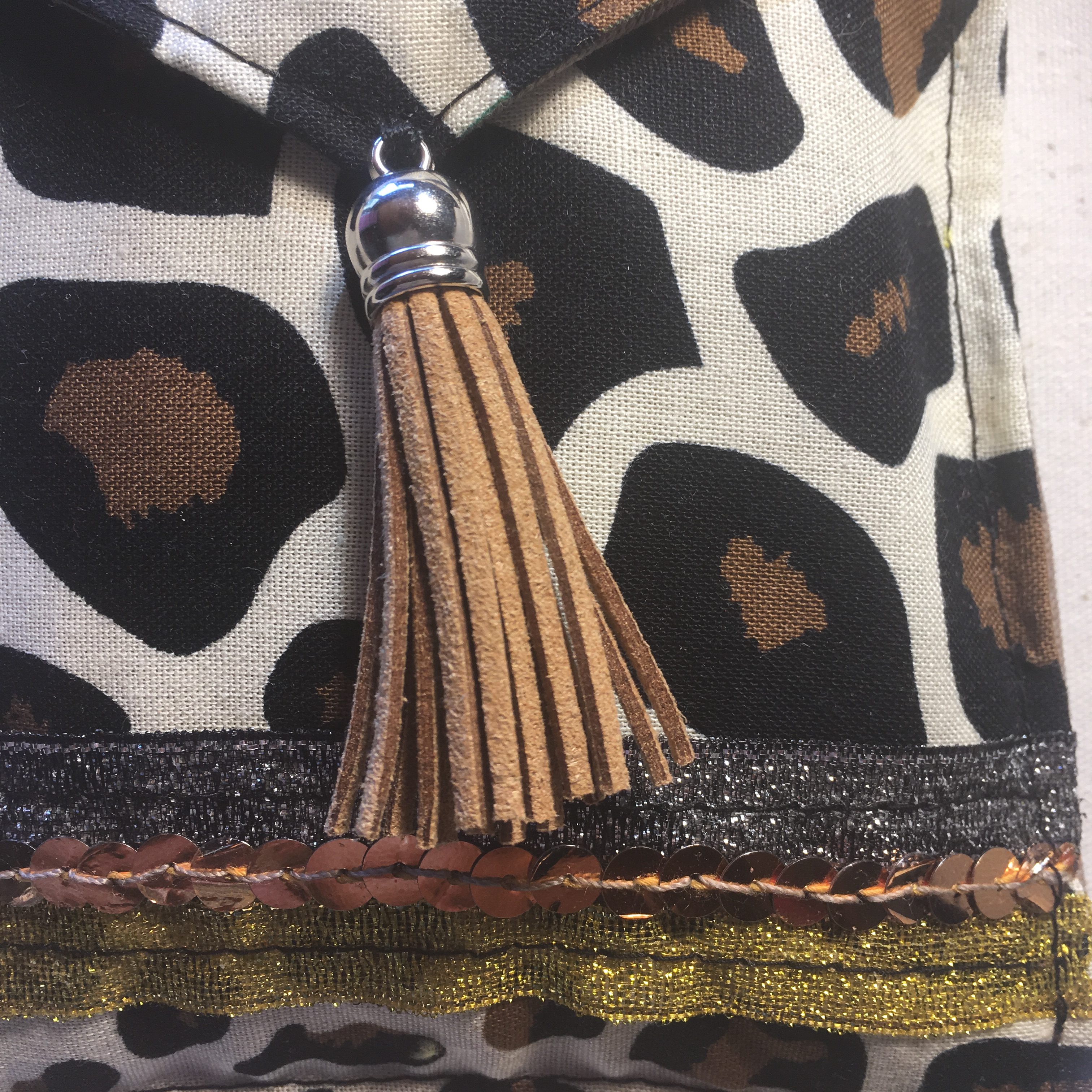 Etui à lunettes réalisé en tissus motif girafe, entièrement doublé, format 19X11 cm, agrémenté d’un ruban de paillettes or et d’un pompon en daim marron.
