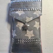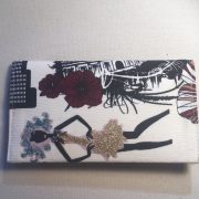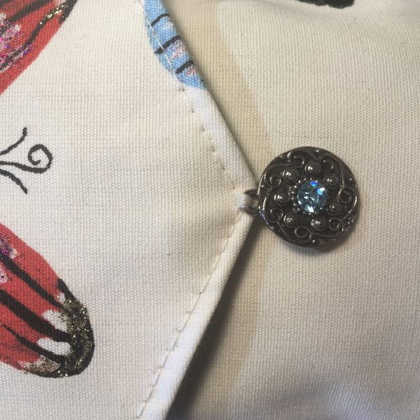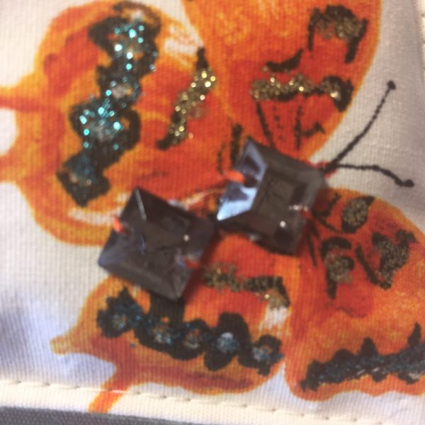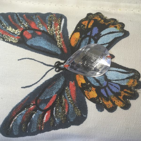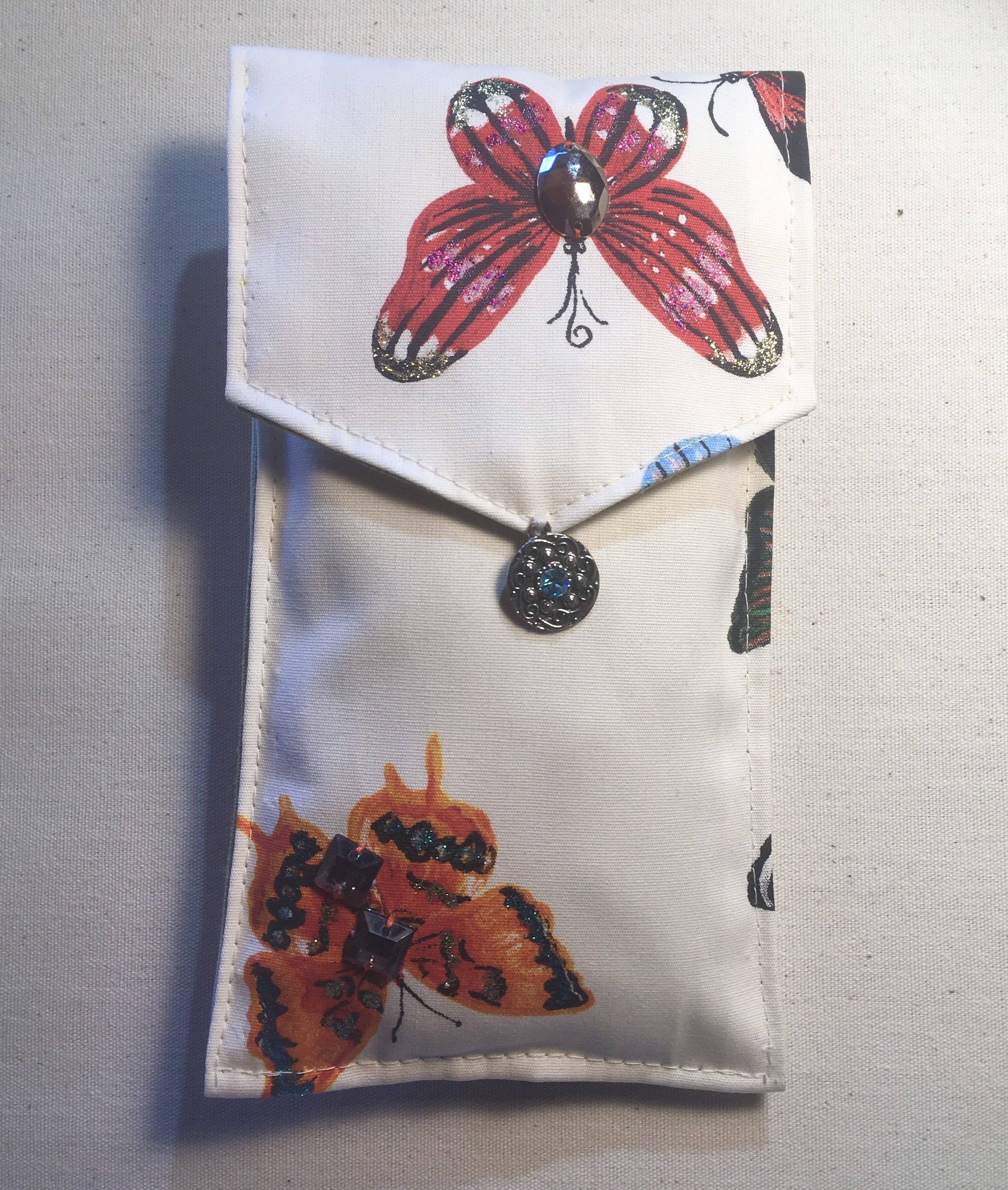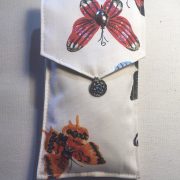 Etui à lunettes realisé en tissu à motifs papillons, format 19X11 cm, pampille acier et perle bleue sur le rabat,