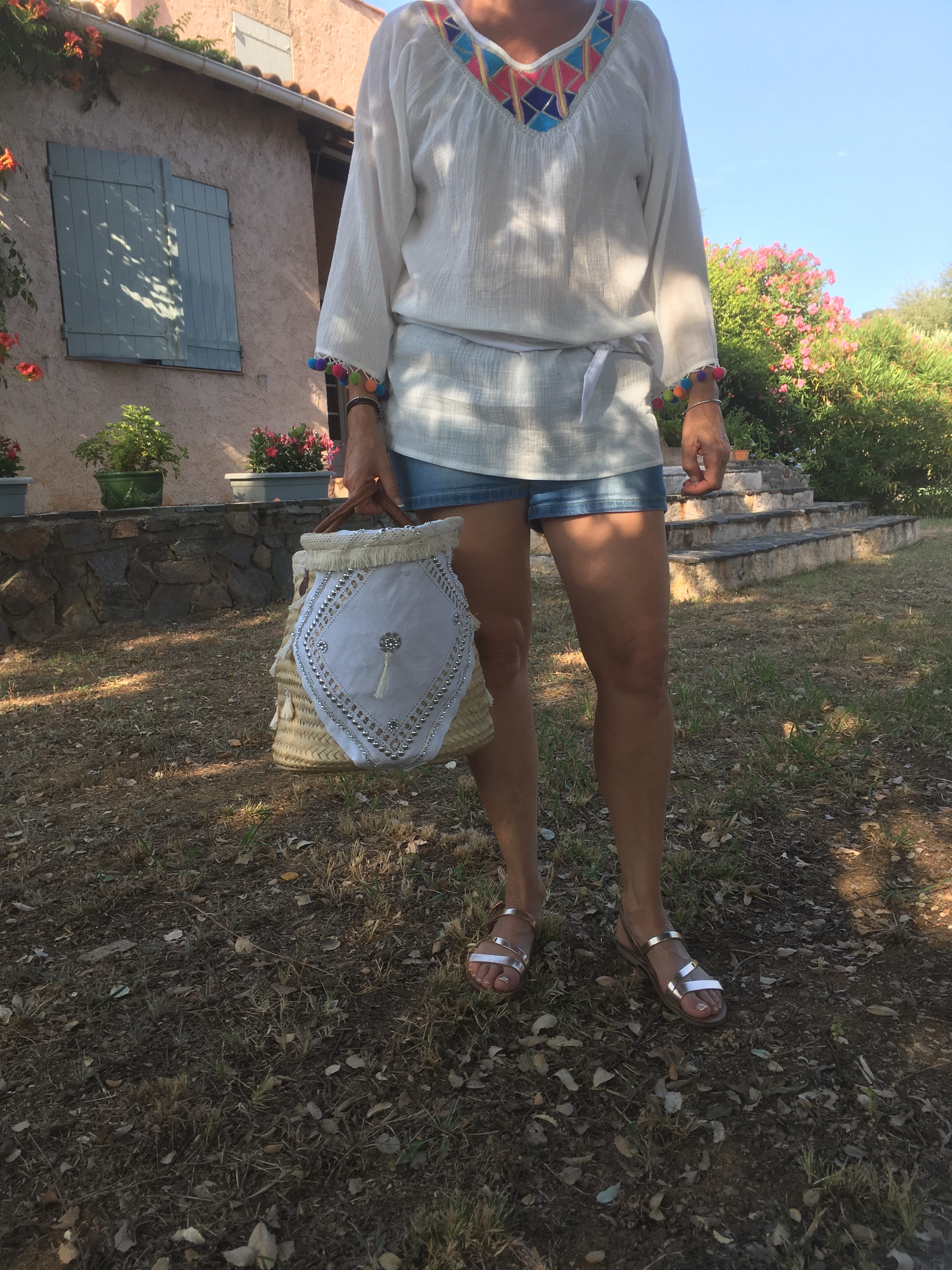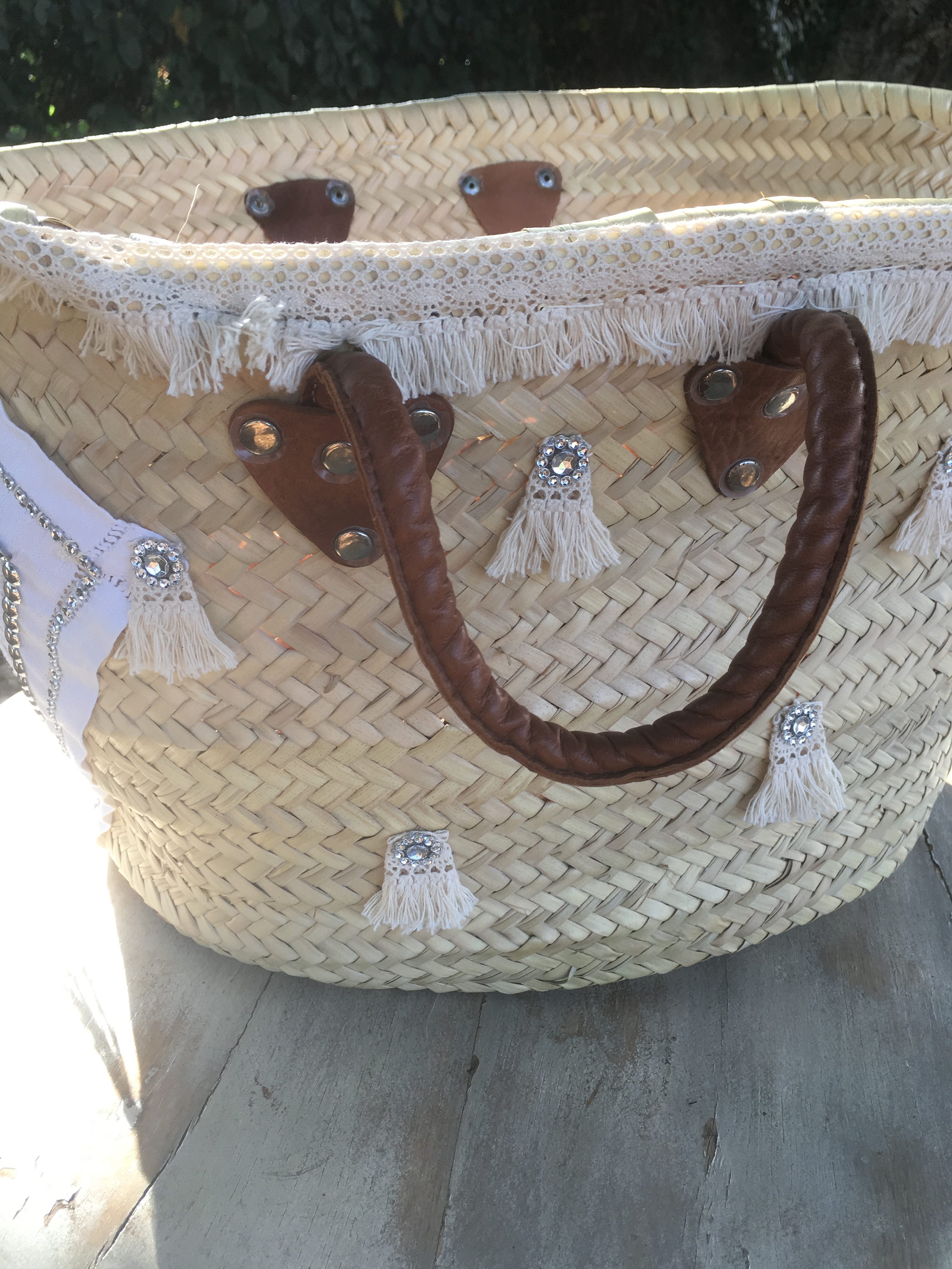 Grand panier de plage en osier, agrémenté de carrés de lin et dentelles, de rubans de clous argentés, de cabochon en métal avec pompons. Bordure haute en franges de coton beige.