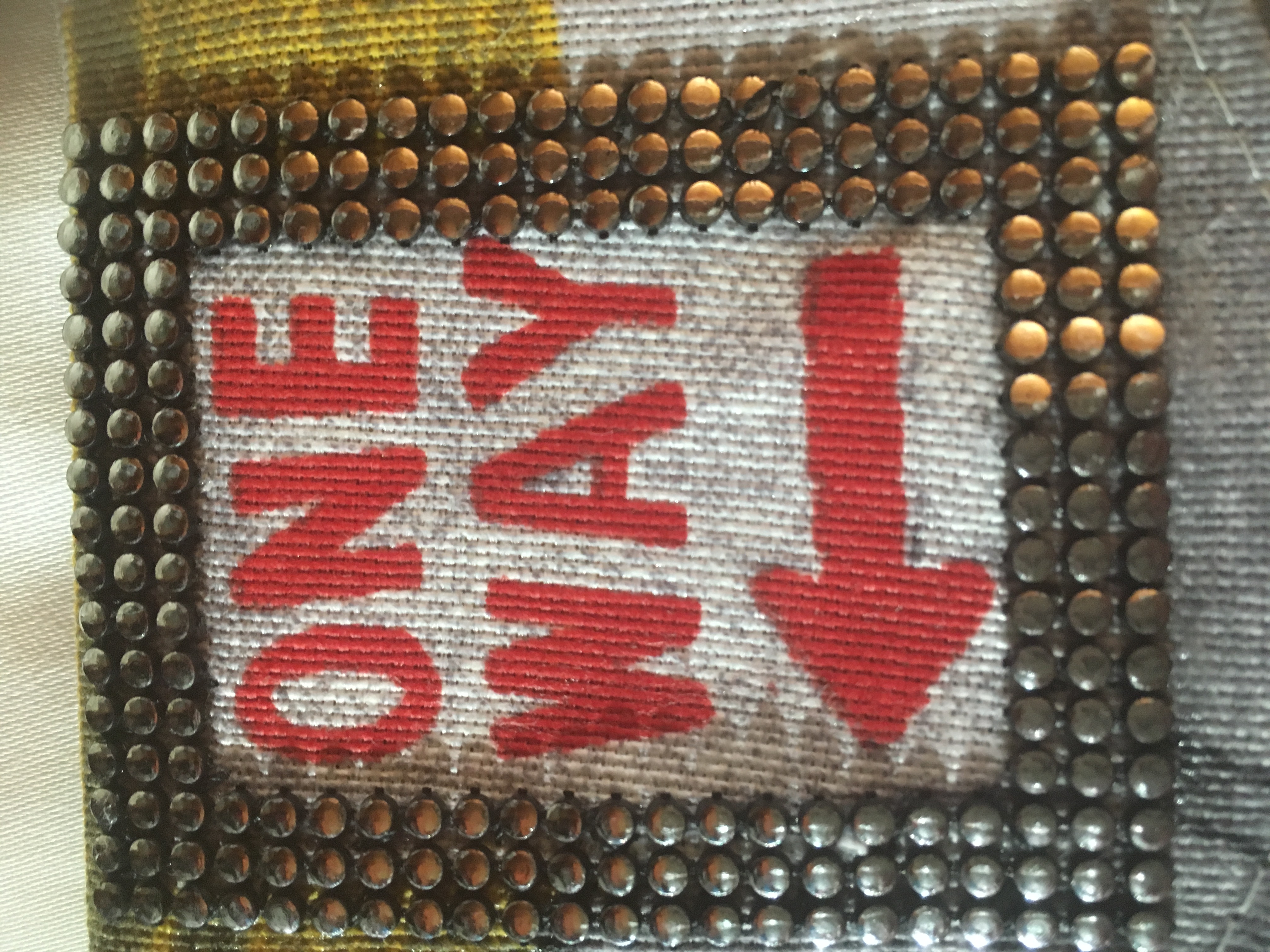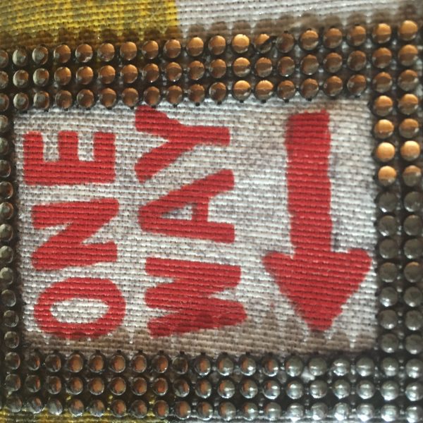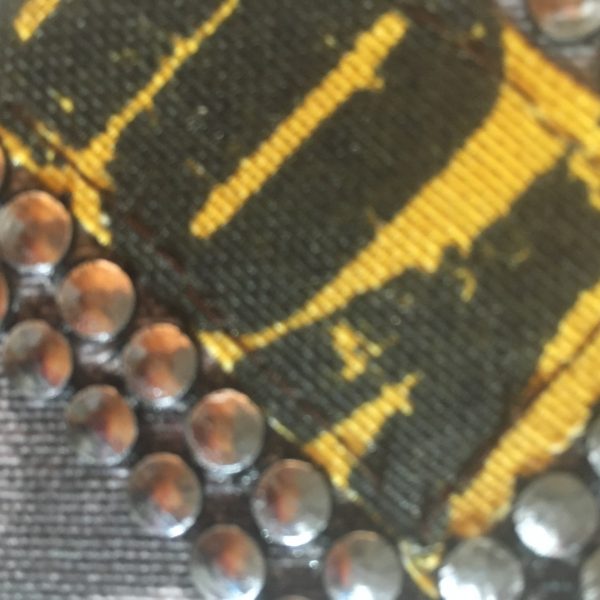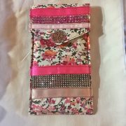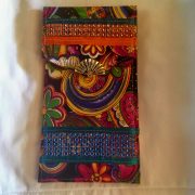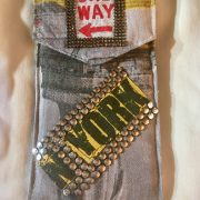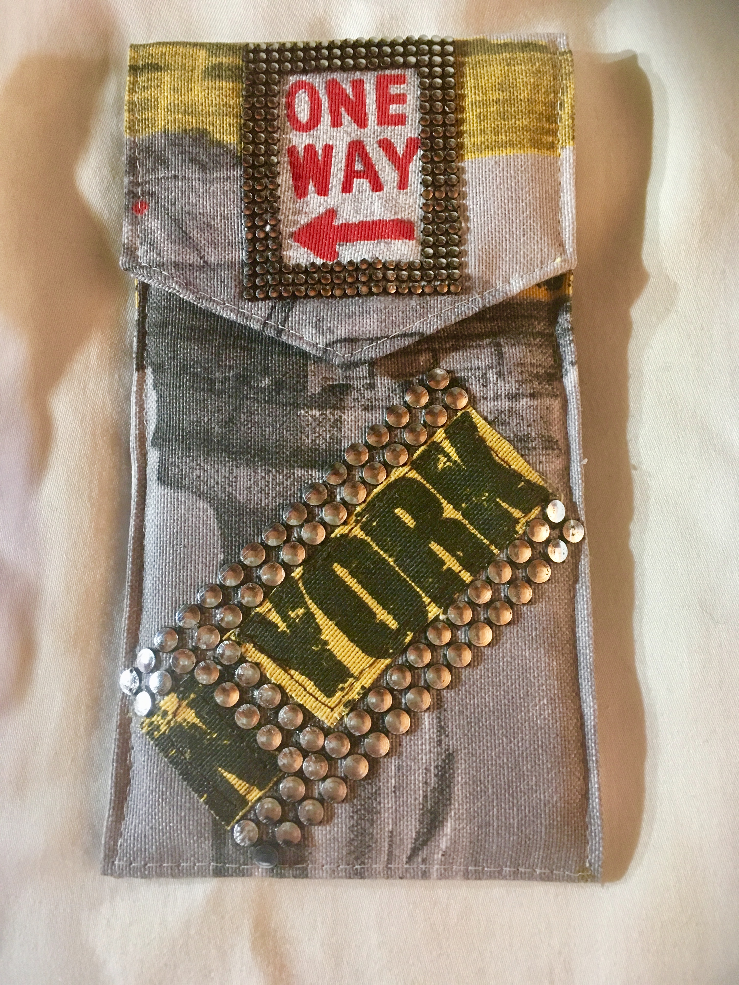 Etui à lunette réalisé en tissu motif New York, agrémenté de deux rubans de clous argentés. Fermeture par pression. Format 14X21 cm. Pochette intérieure en flanelle grise intégrée pour protection des verres.