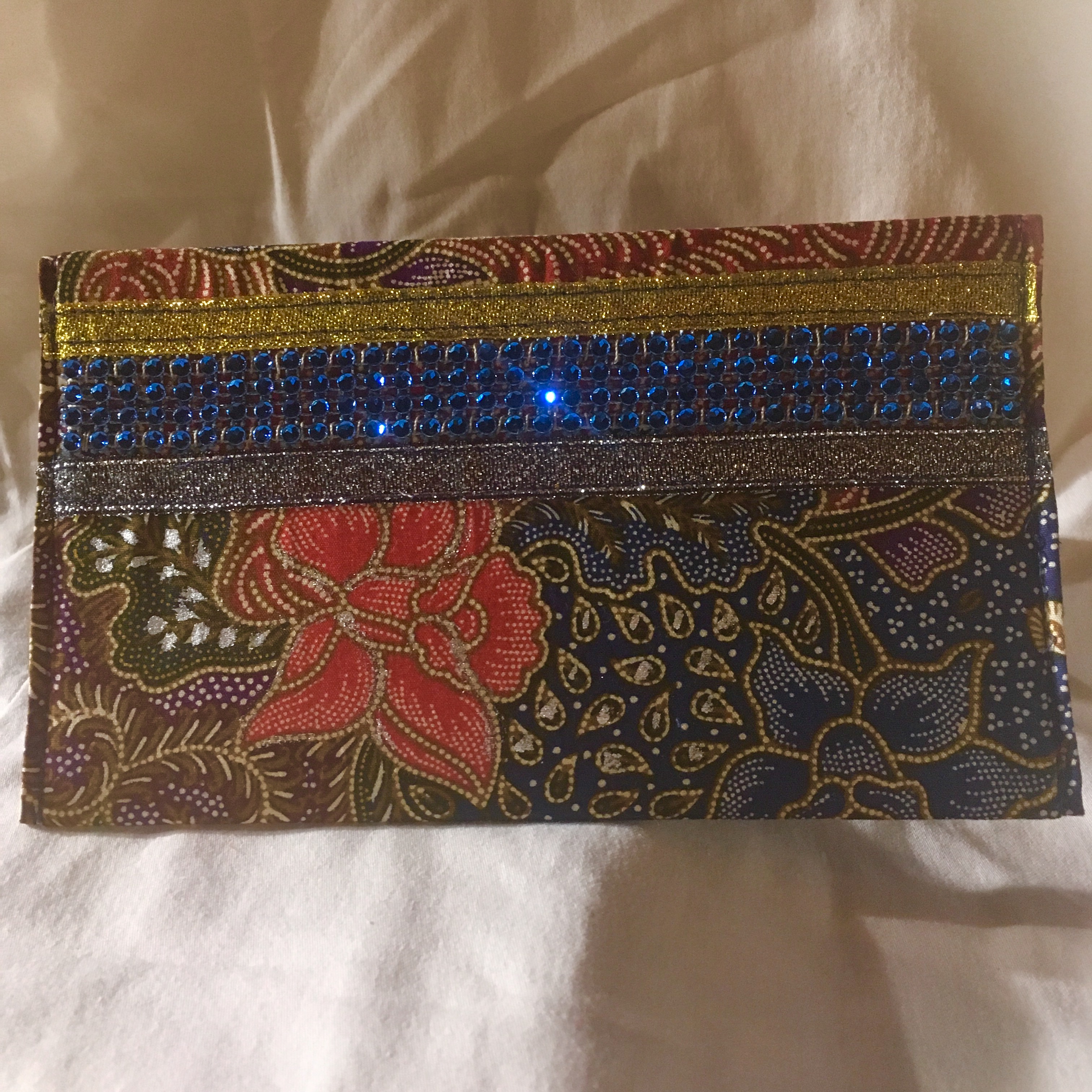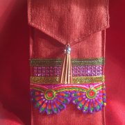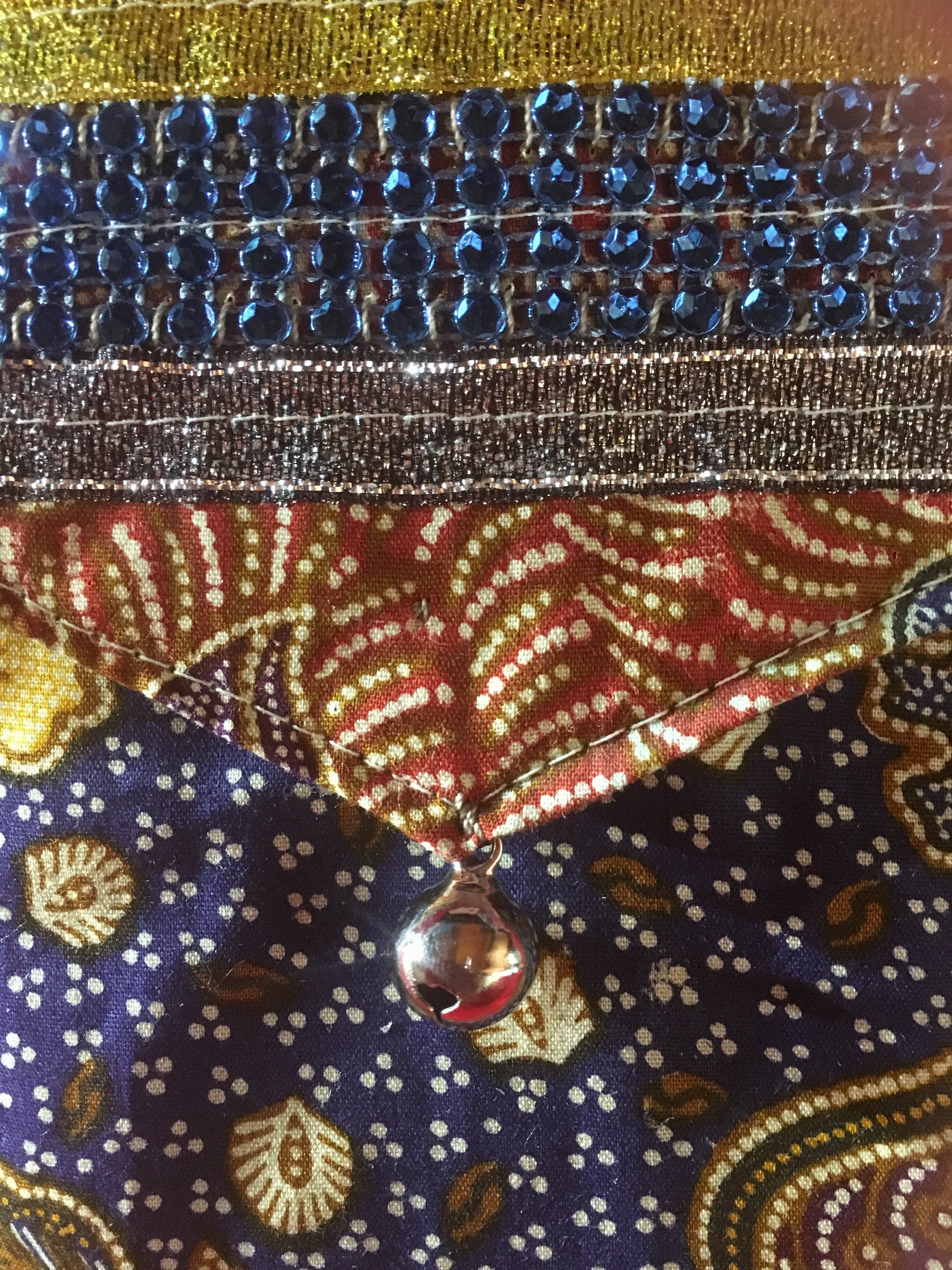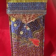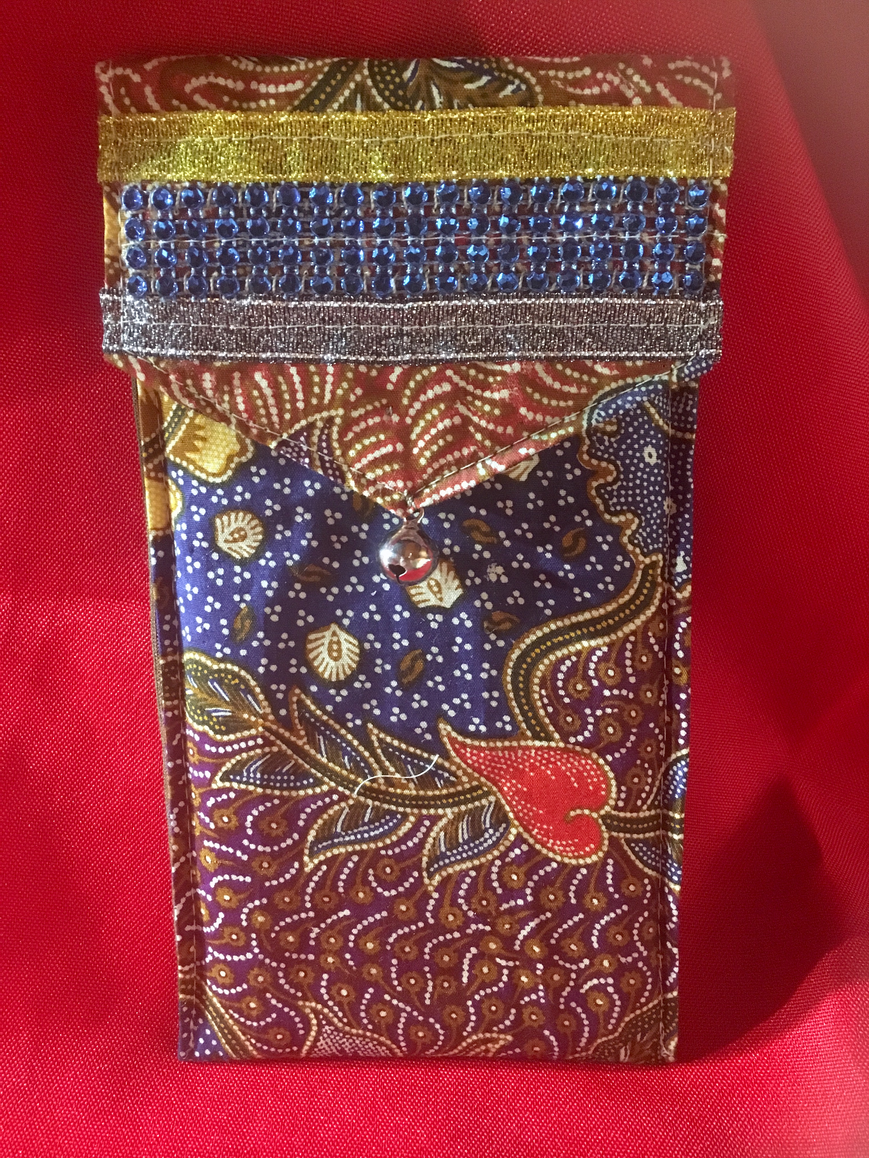 Etui à lunettes réalisé en tissu indien, entièrement doublé, fermeture par pression, petite clochette décorative sur le rabat.