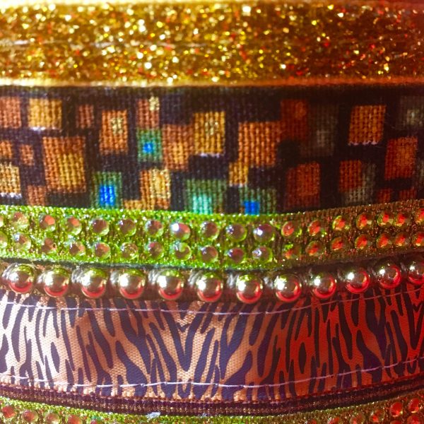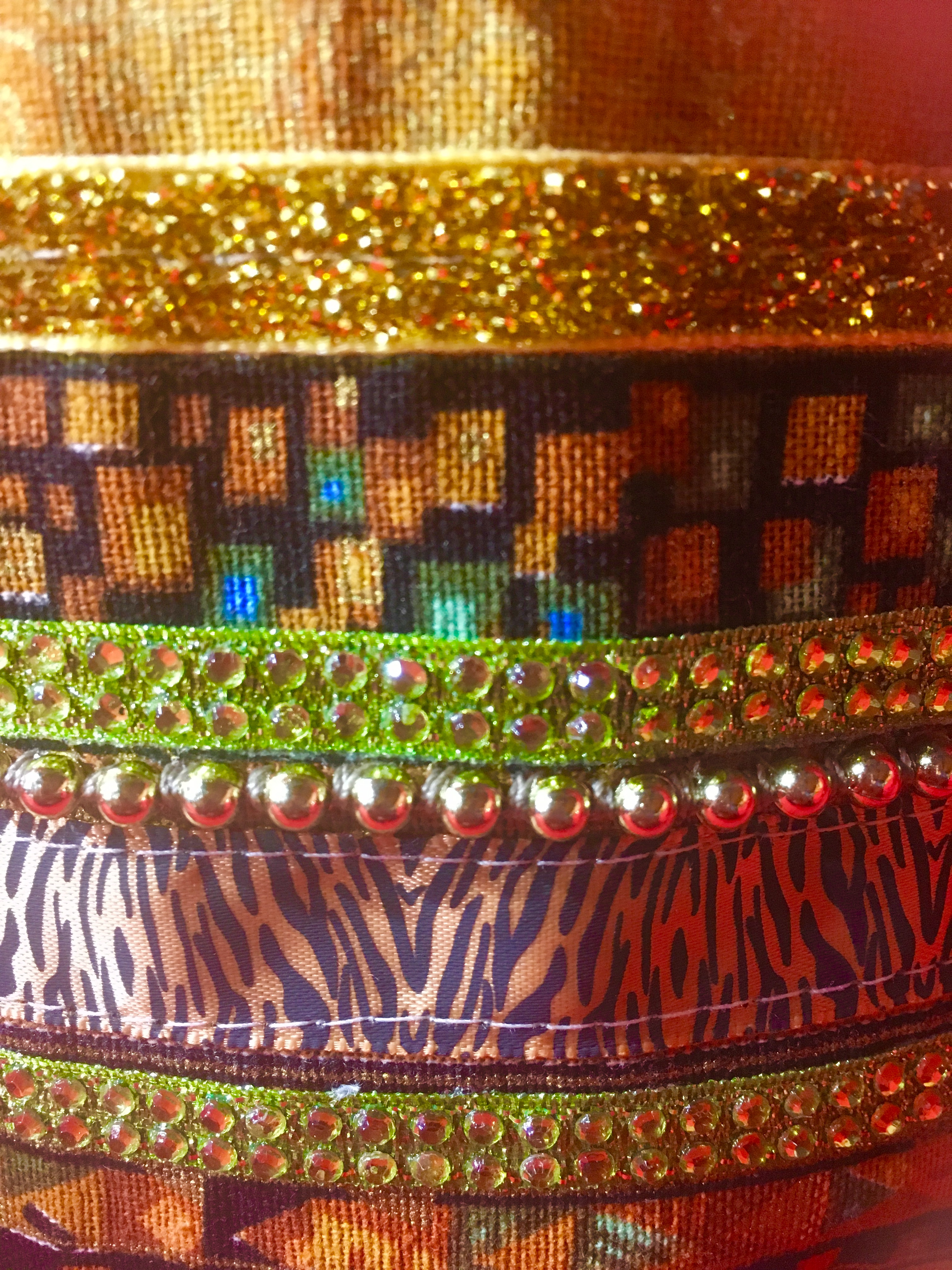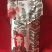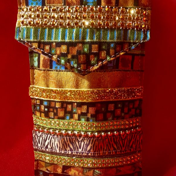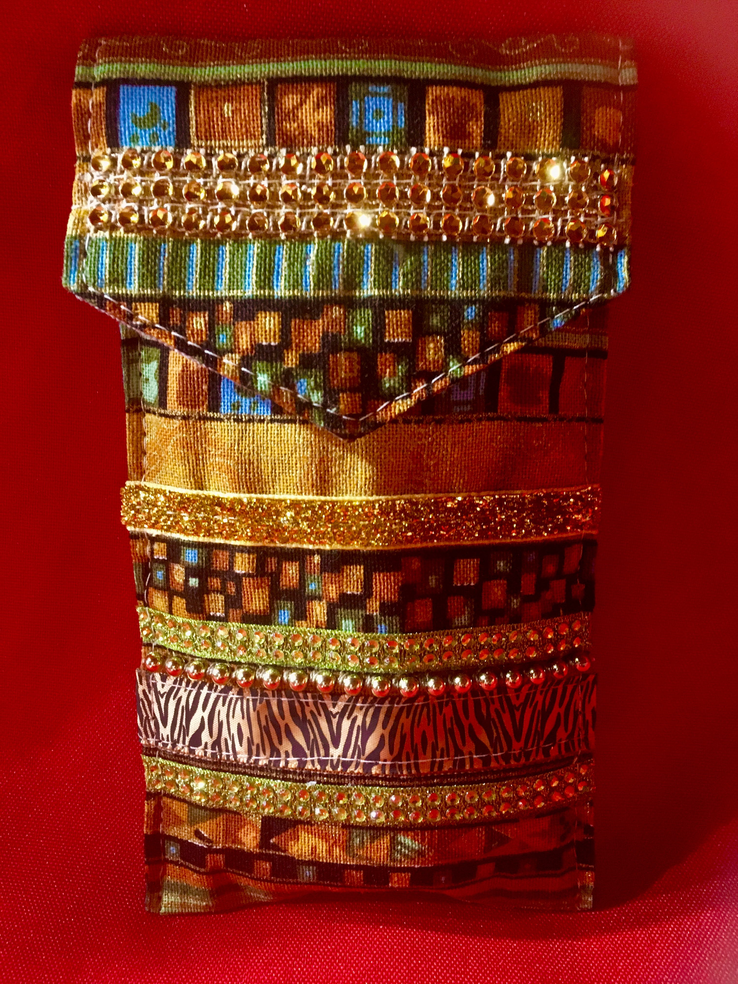 Etui à lunettes ou à téléphone réalisé en tissu ethnique, agrémenté de ruban et de strass or, entièrement doublé, fermleture par pression. Format fermé 18X10 cm