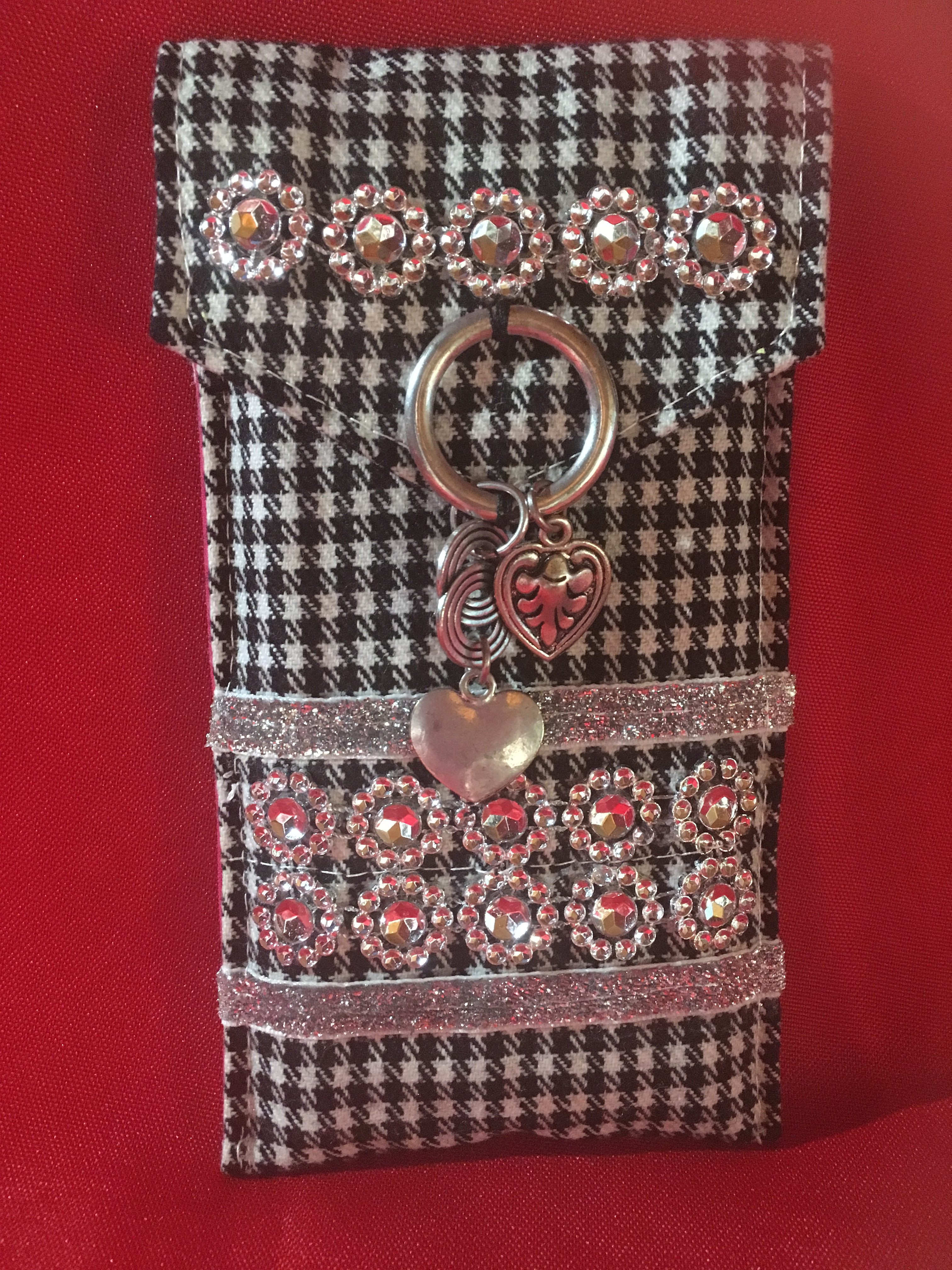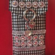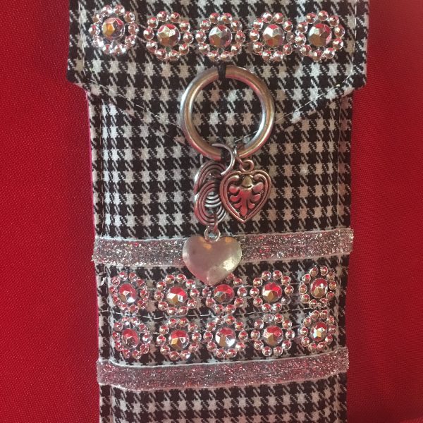 Etui à stylos réalisé en tissu lainé fin a carreaux noir et blanc, entièrement doublé, agrémenté de strass et de rubans argentés. Décoration sur le rabat anneau et pampilles argentés. Fermeture par pression. Format 18X10 cm