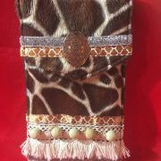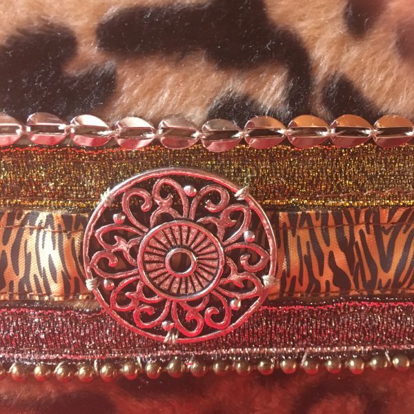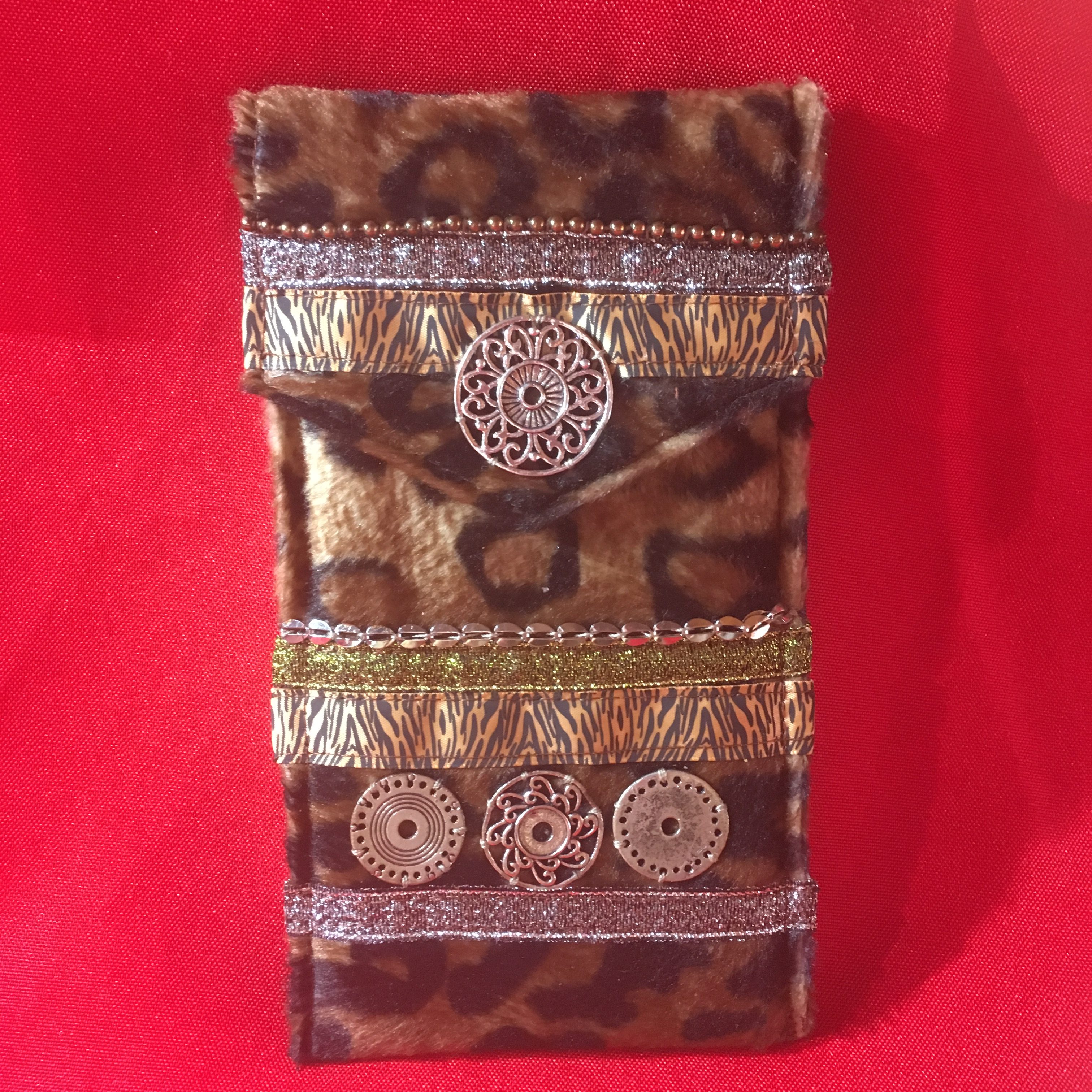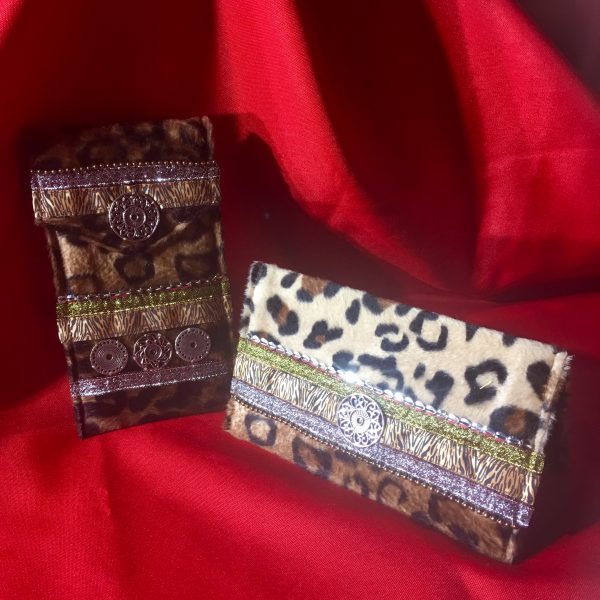 Etui pour chequier, format standart, réalisé en tissu fausse fourrure motif lpanthere, agrémenté de rubans « tigre », argentés et dorés. Cabochon en metal argenté sur la face avant, entièrement doublé. Format 20X12 cm.
