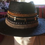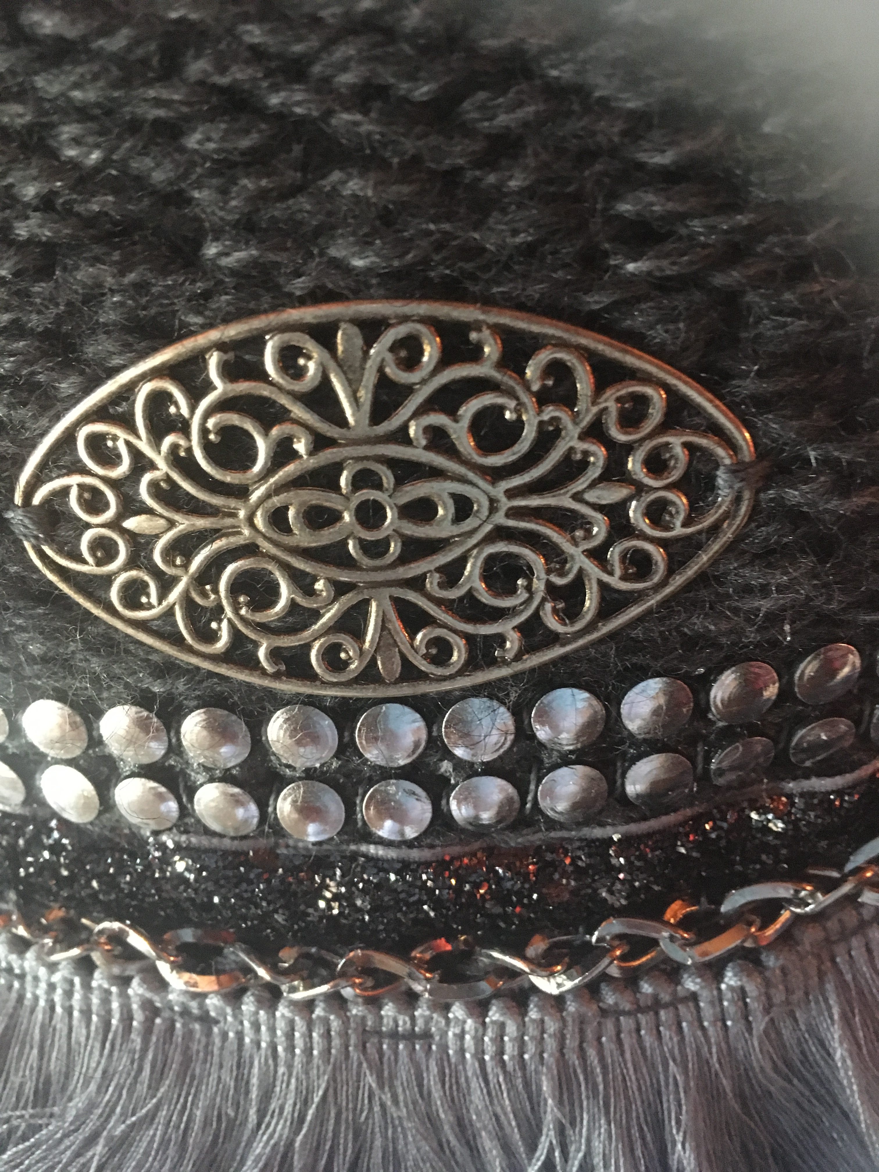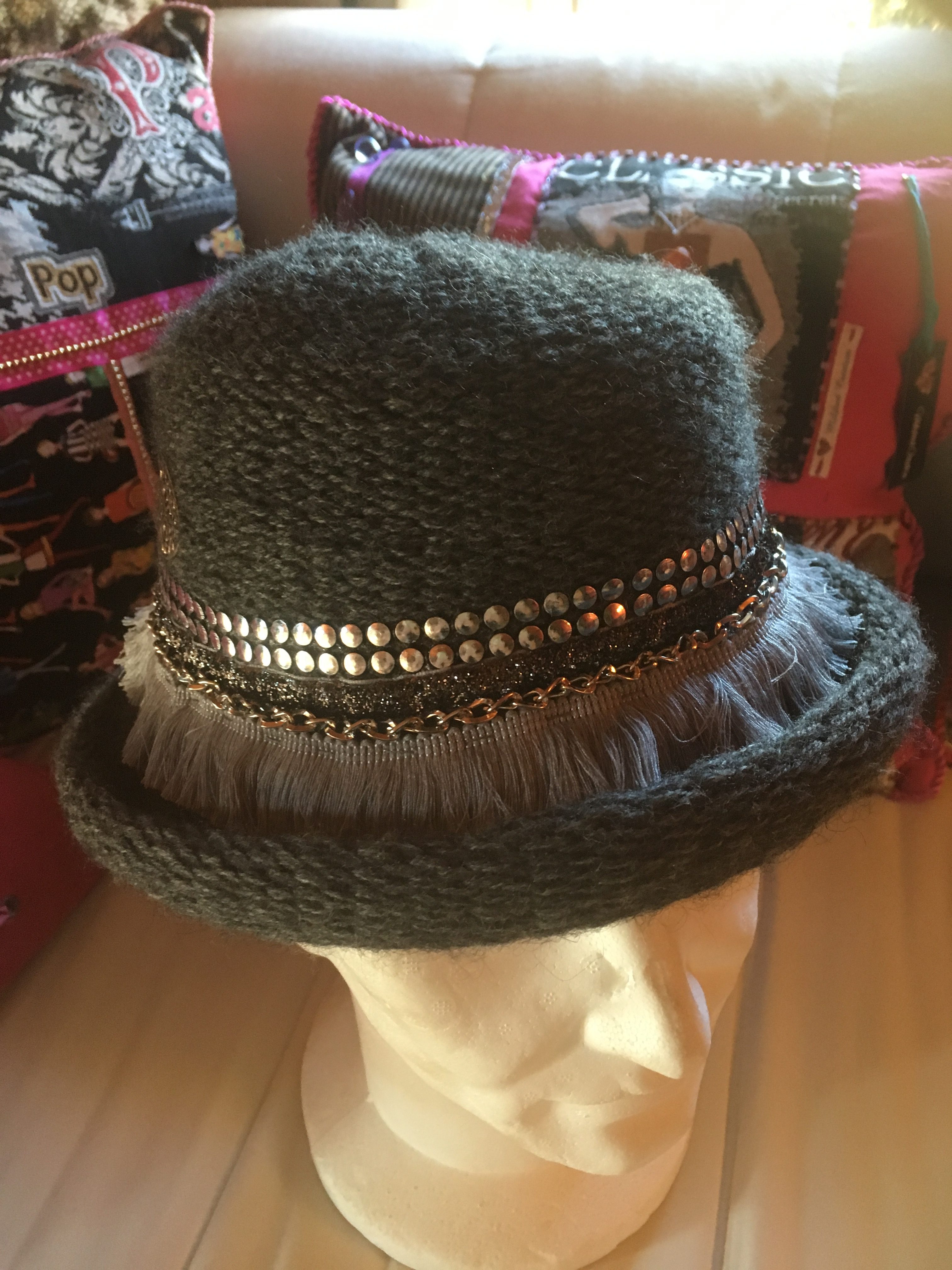Chapeau en laine bouillie gris agrémenté de clous, d’une chaînette acier, d’un ruban de franges grises. Taille unique