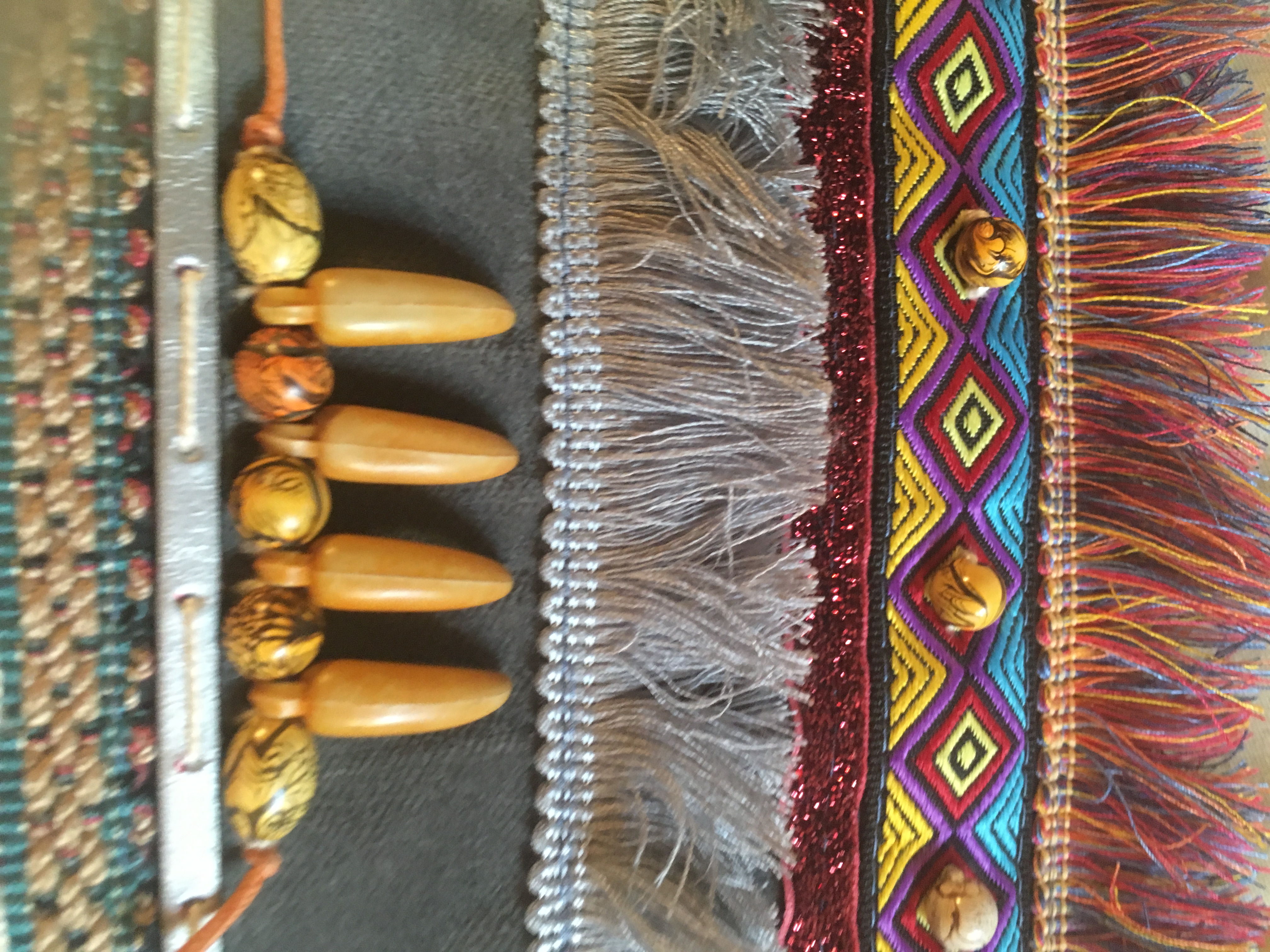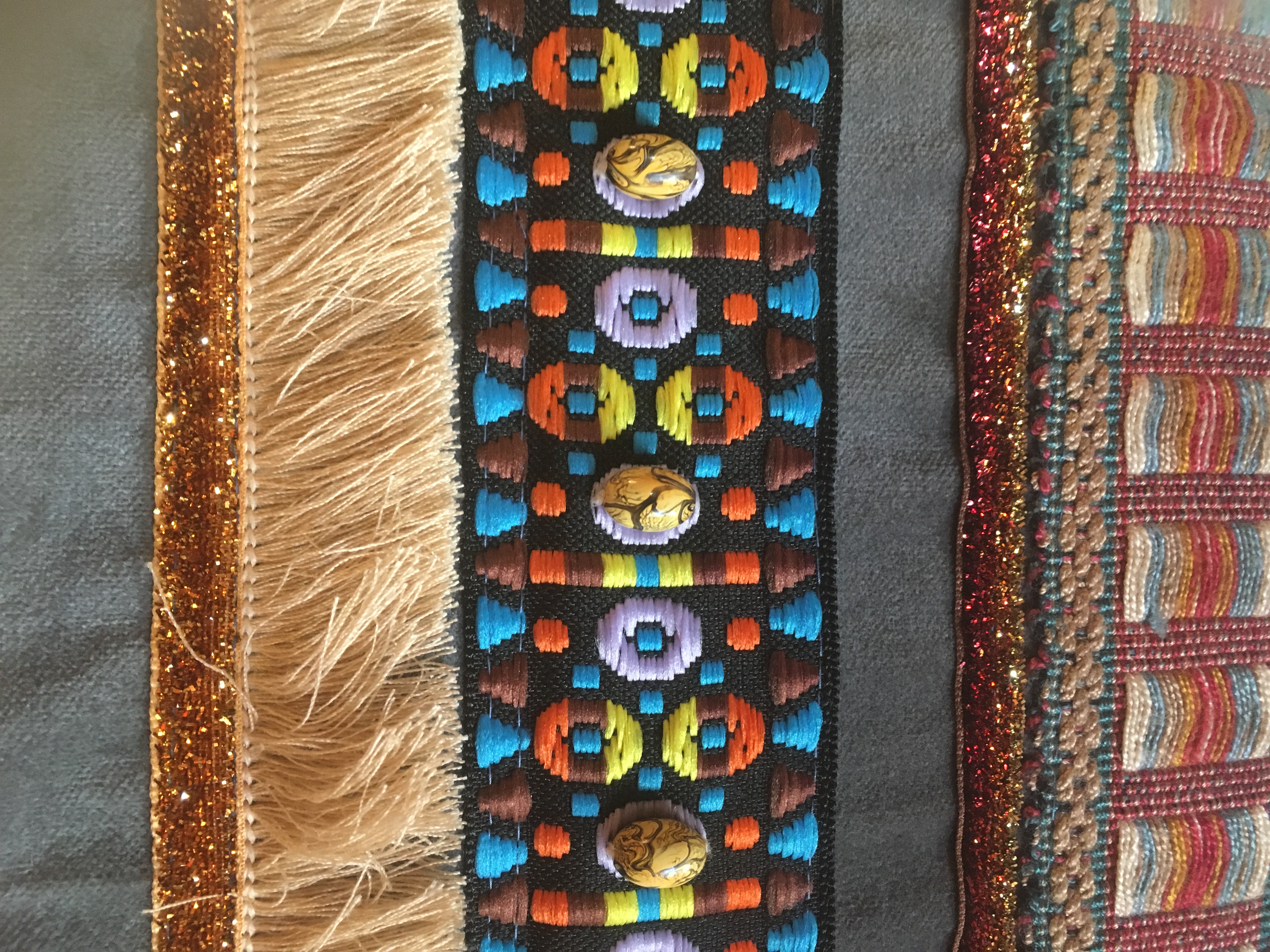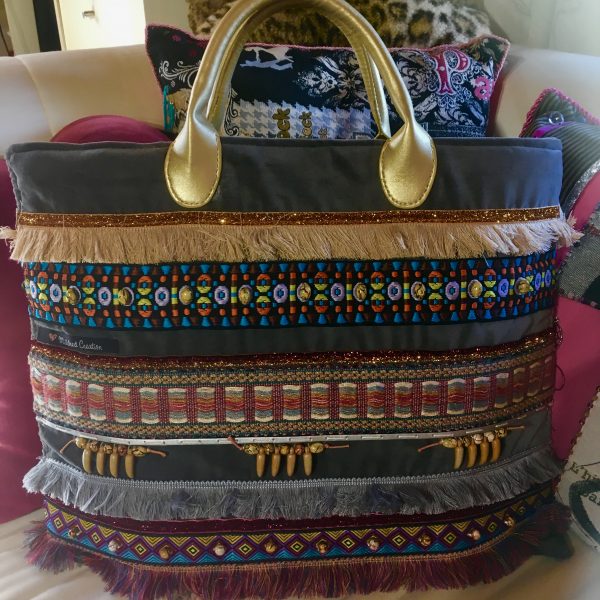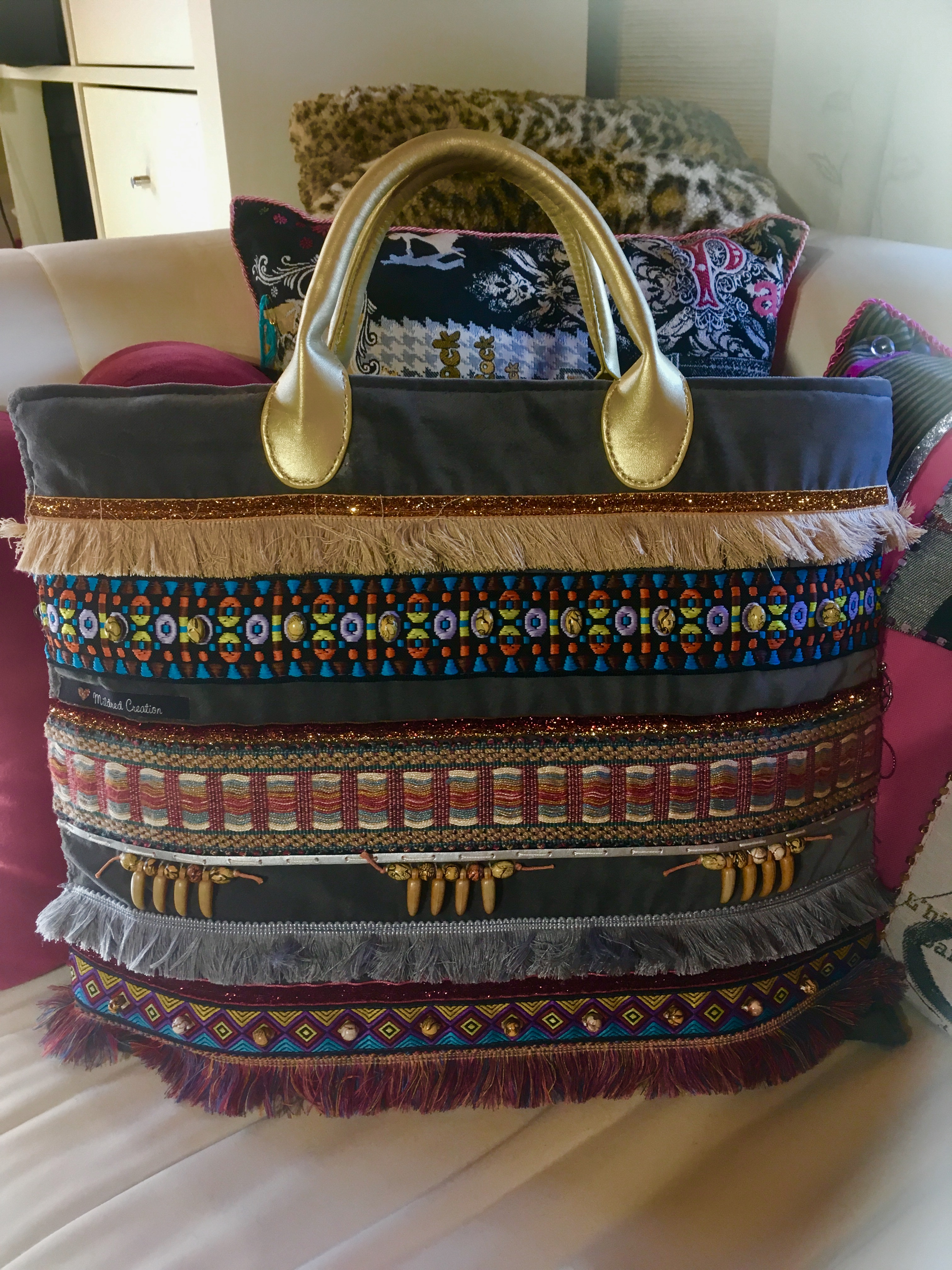 Grand sac besace en velours gris, doublé velours gris style ethnique, agrémenté de perles, rubans, lacets, anses dorées en PVC