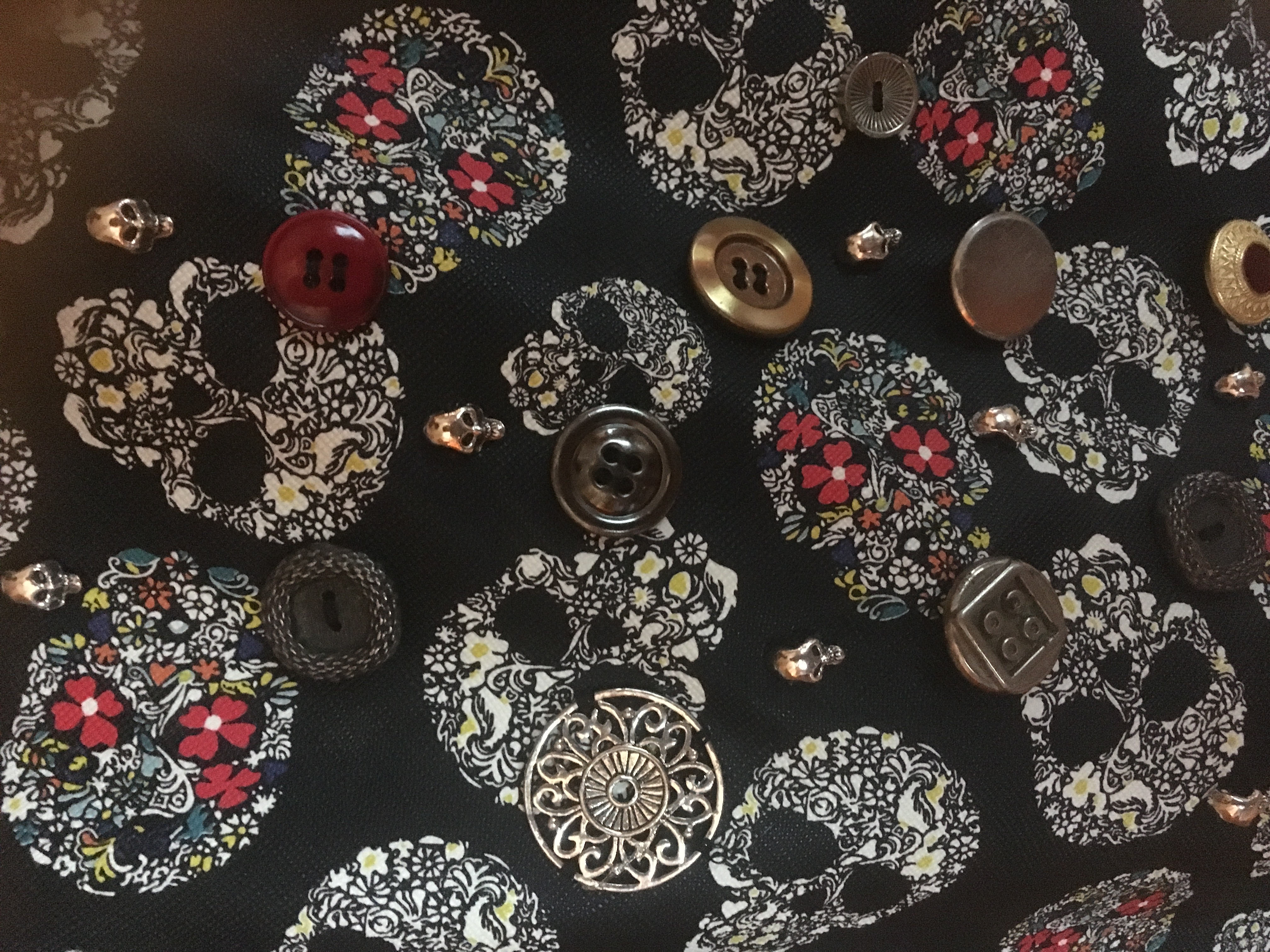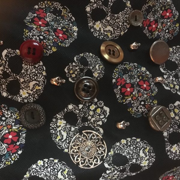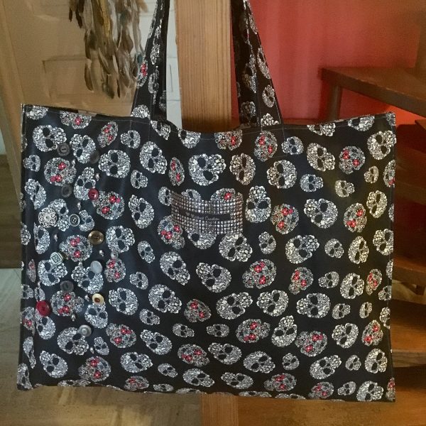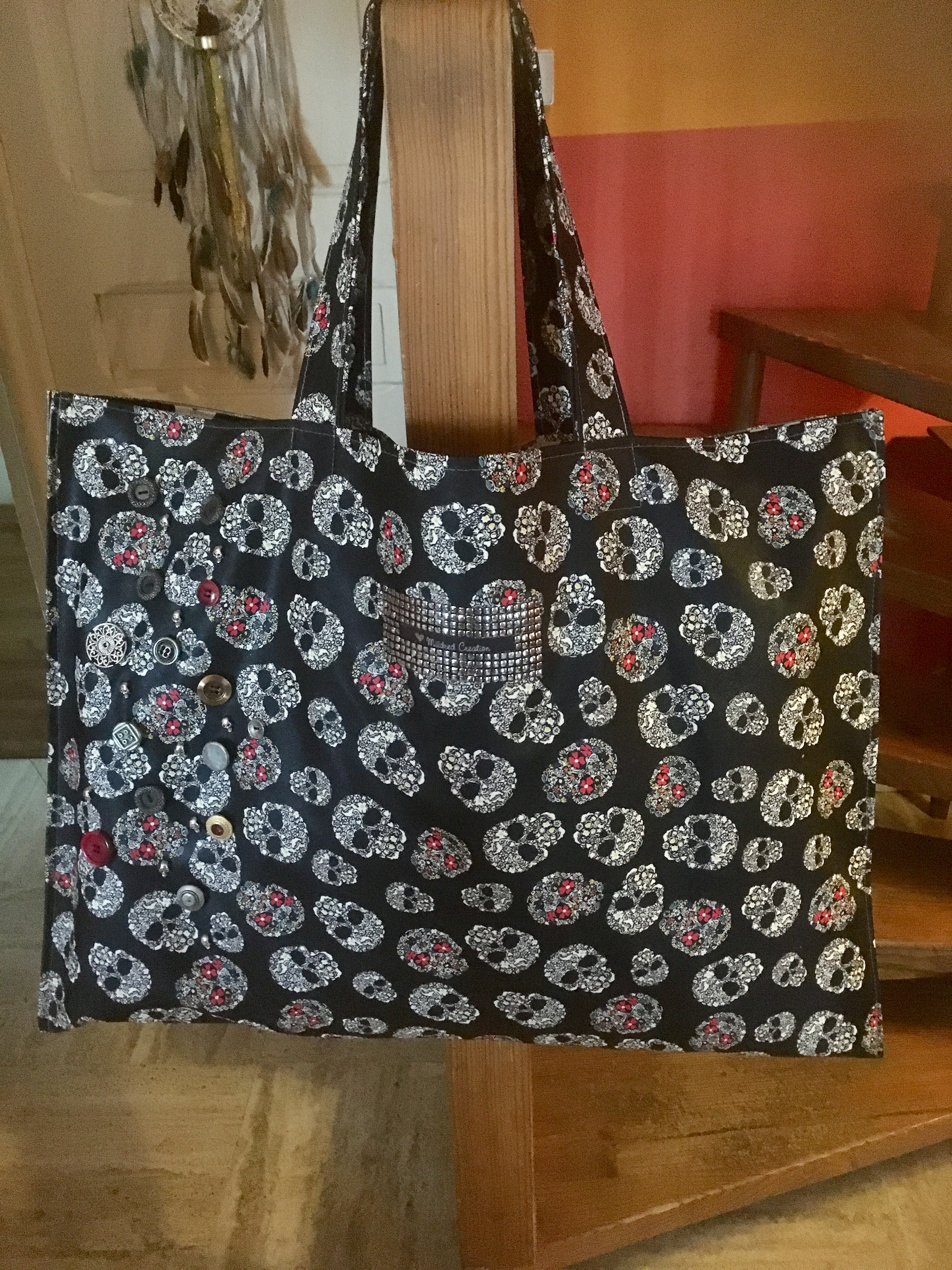 grand sac de plage en PVC doublé tissus avec etoiles noir et blanc exterieur motif tete de mort
