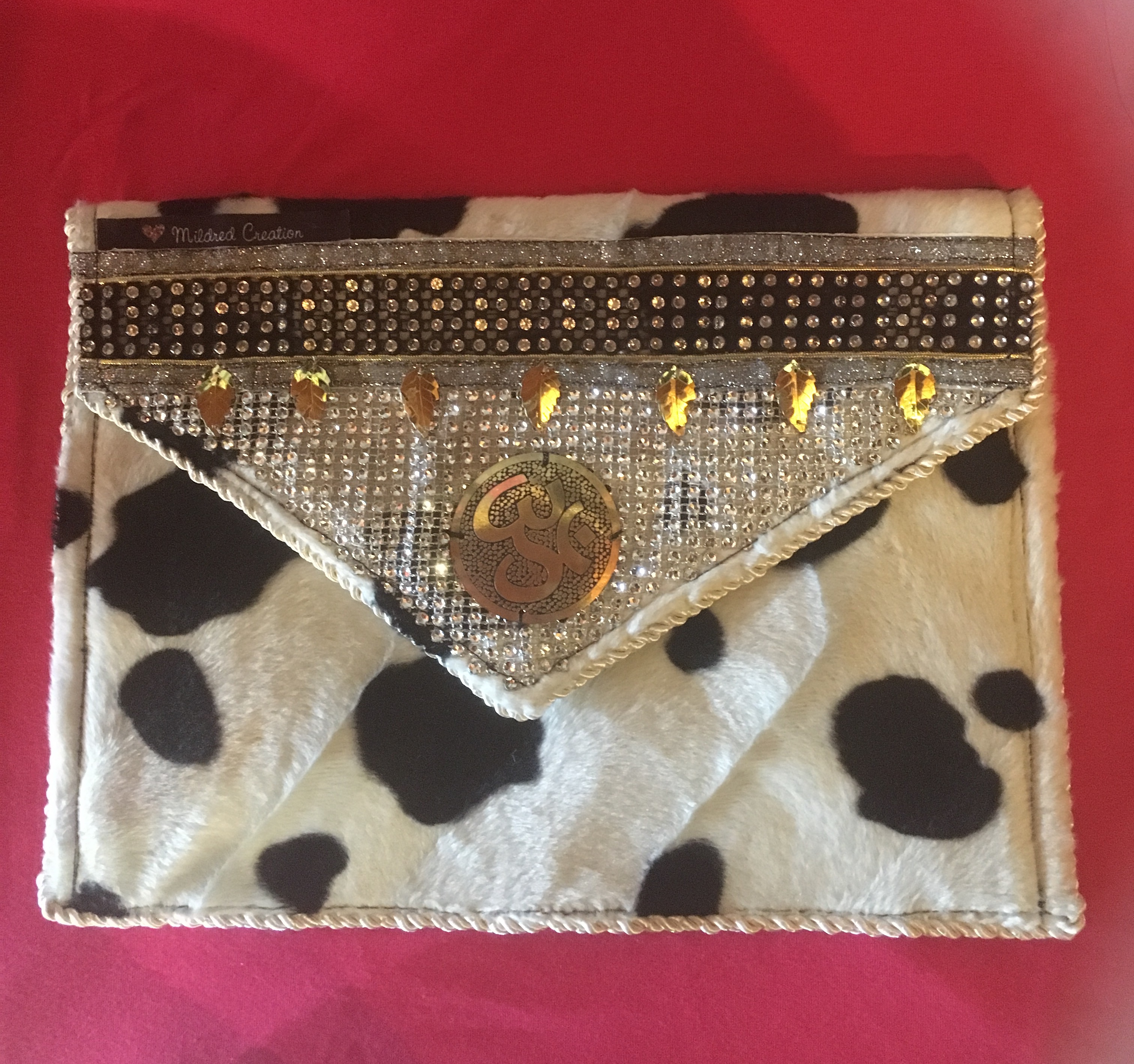 Pochette a main imprimé poils vache agrémentée de strass et de décorations en feuilles dorées, fermeture par pression, utilisable pour Ipad. Format fermé 29×21 cm