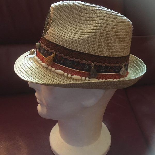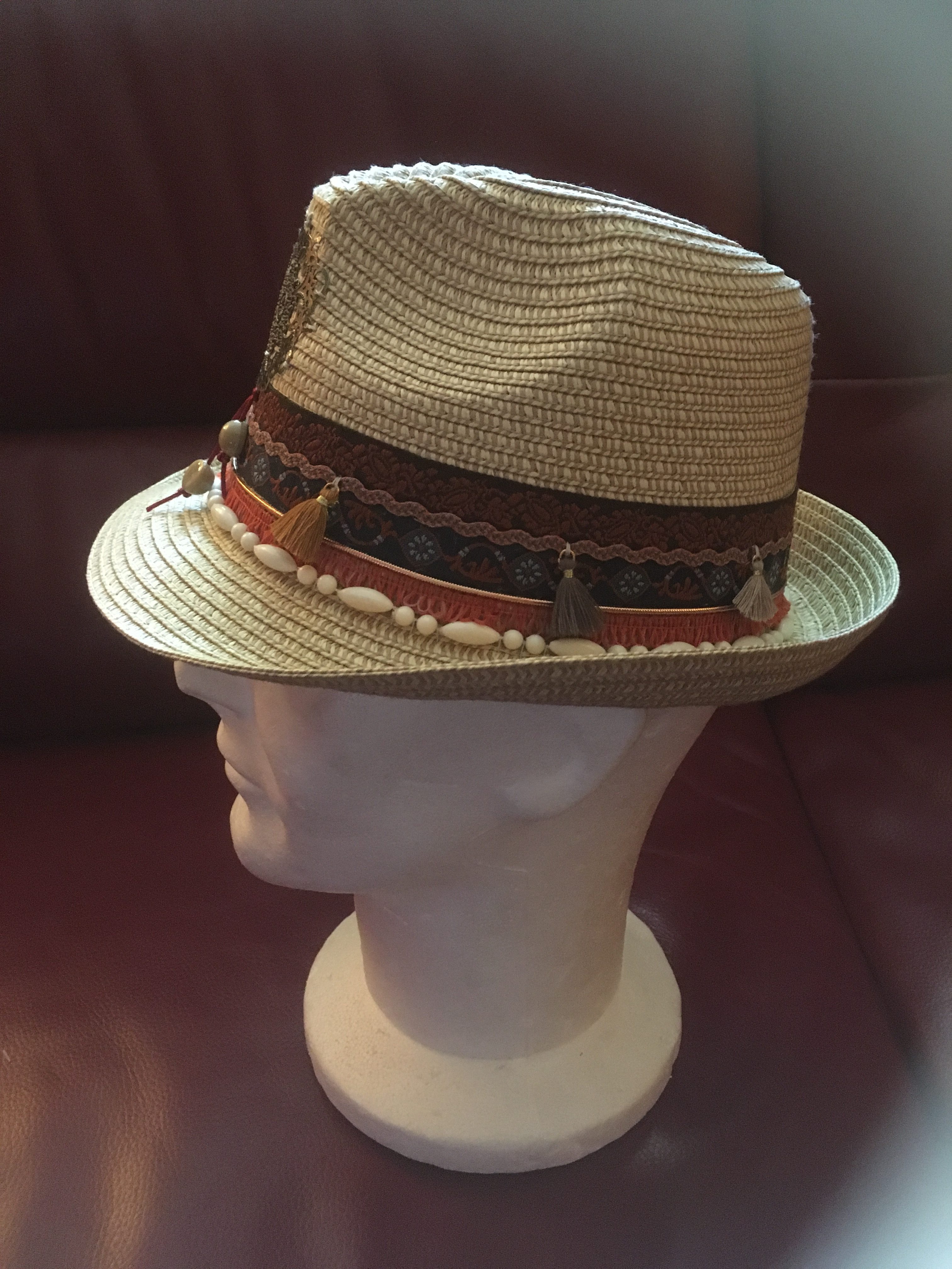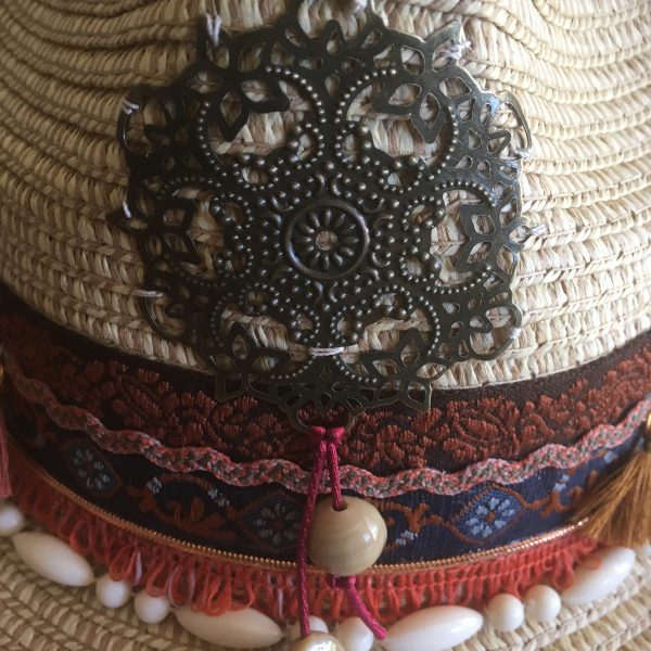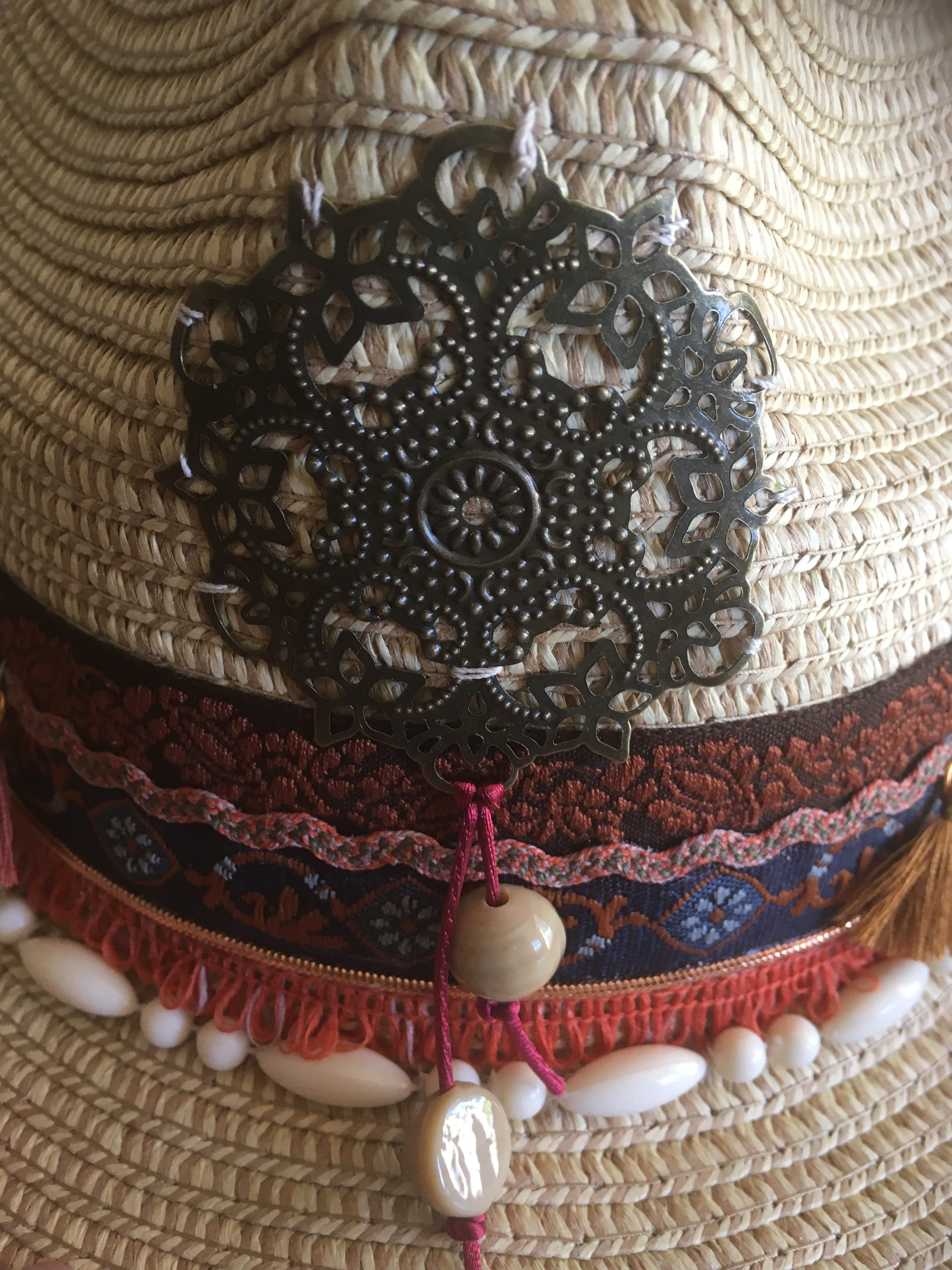 chapeau de paille agrementé de perles, rubans et cabochon en metal mordoré taille 57