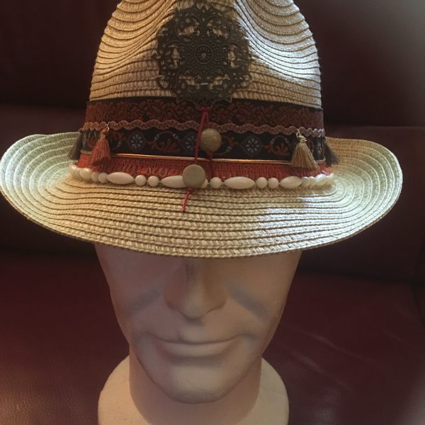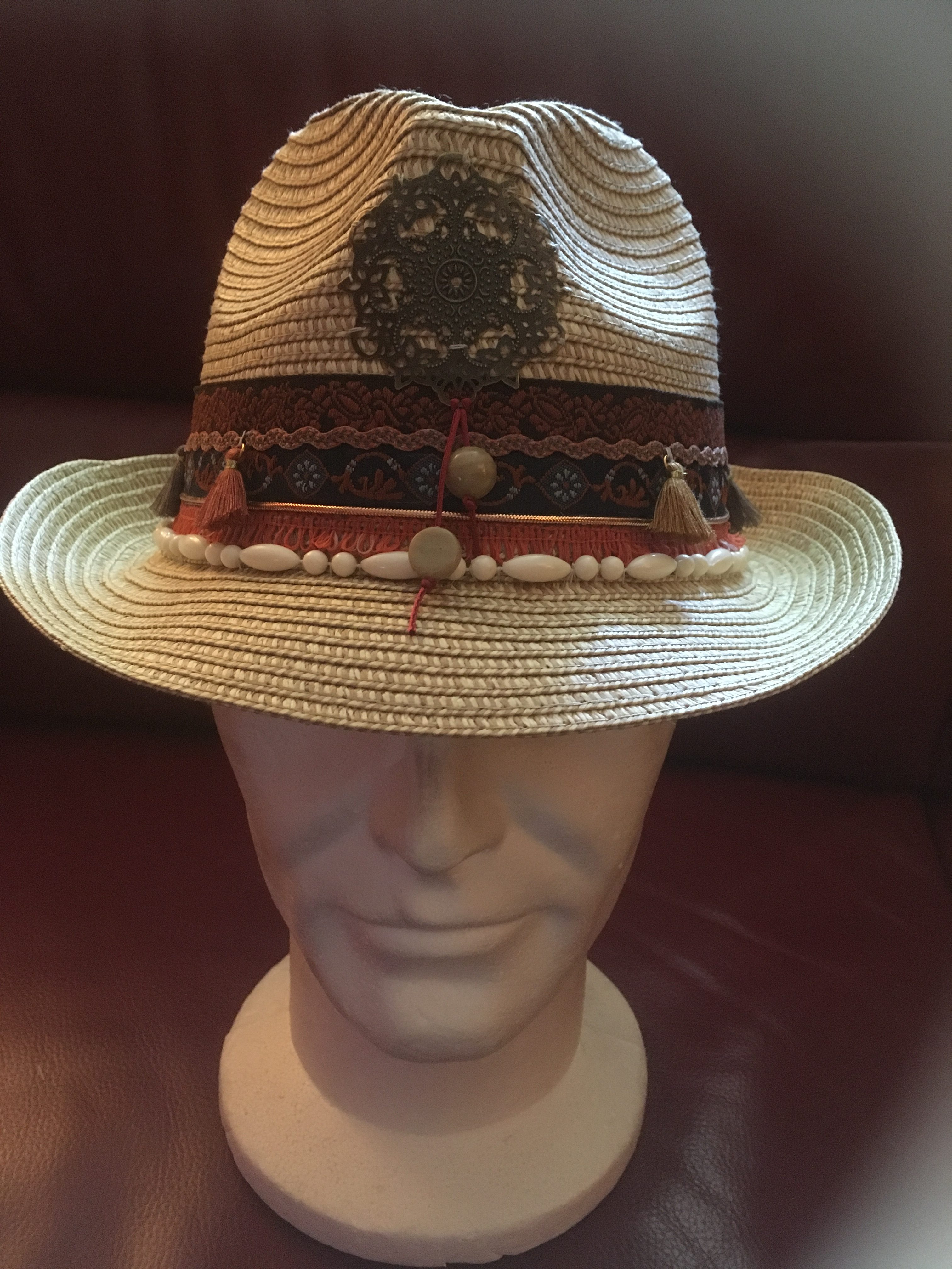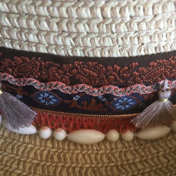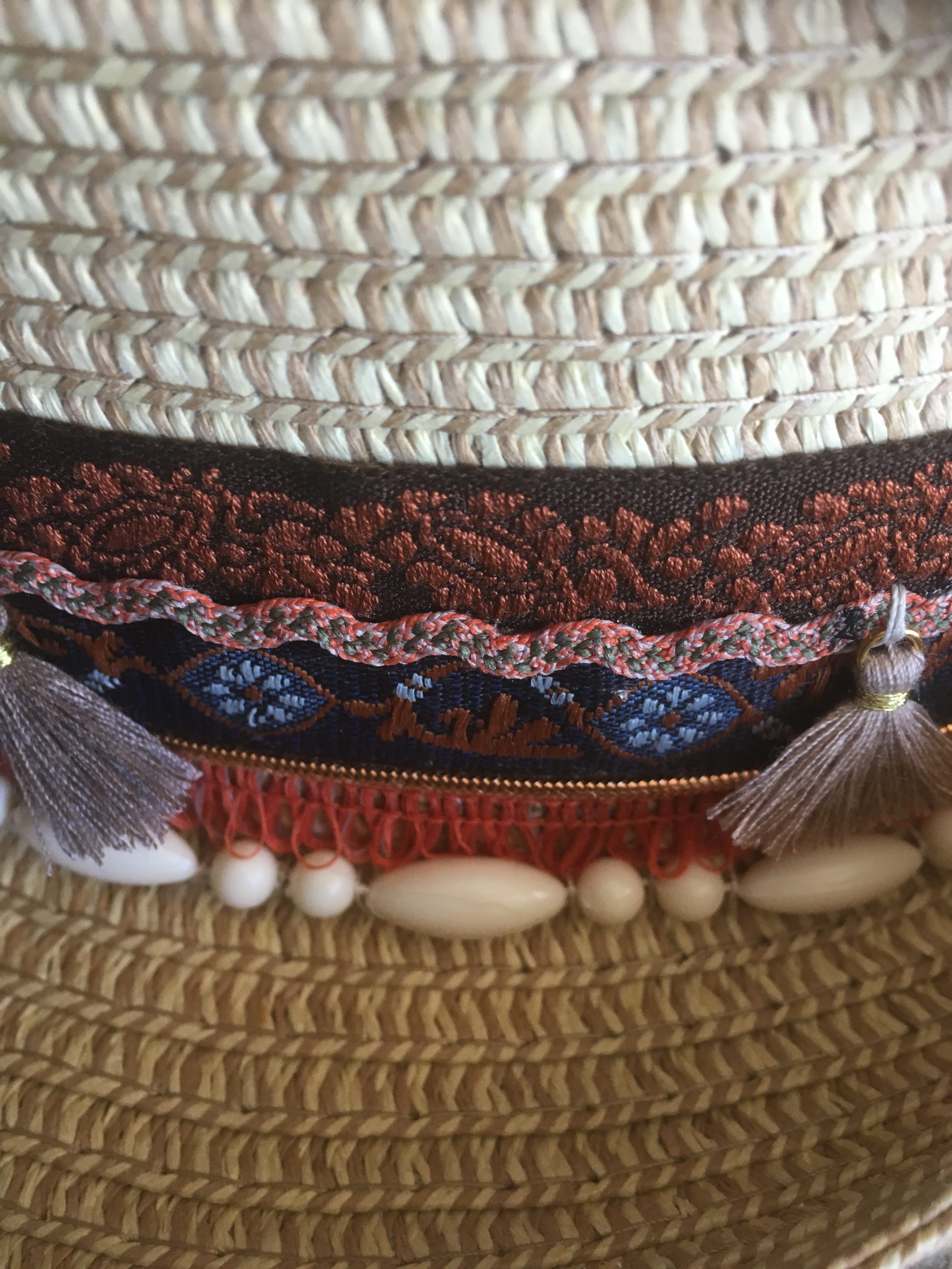 chapeau de paille agrementé de perles, rubans et cabochon en metal mordoré taille 57