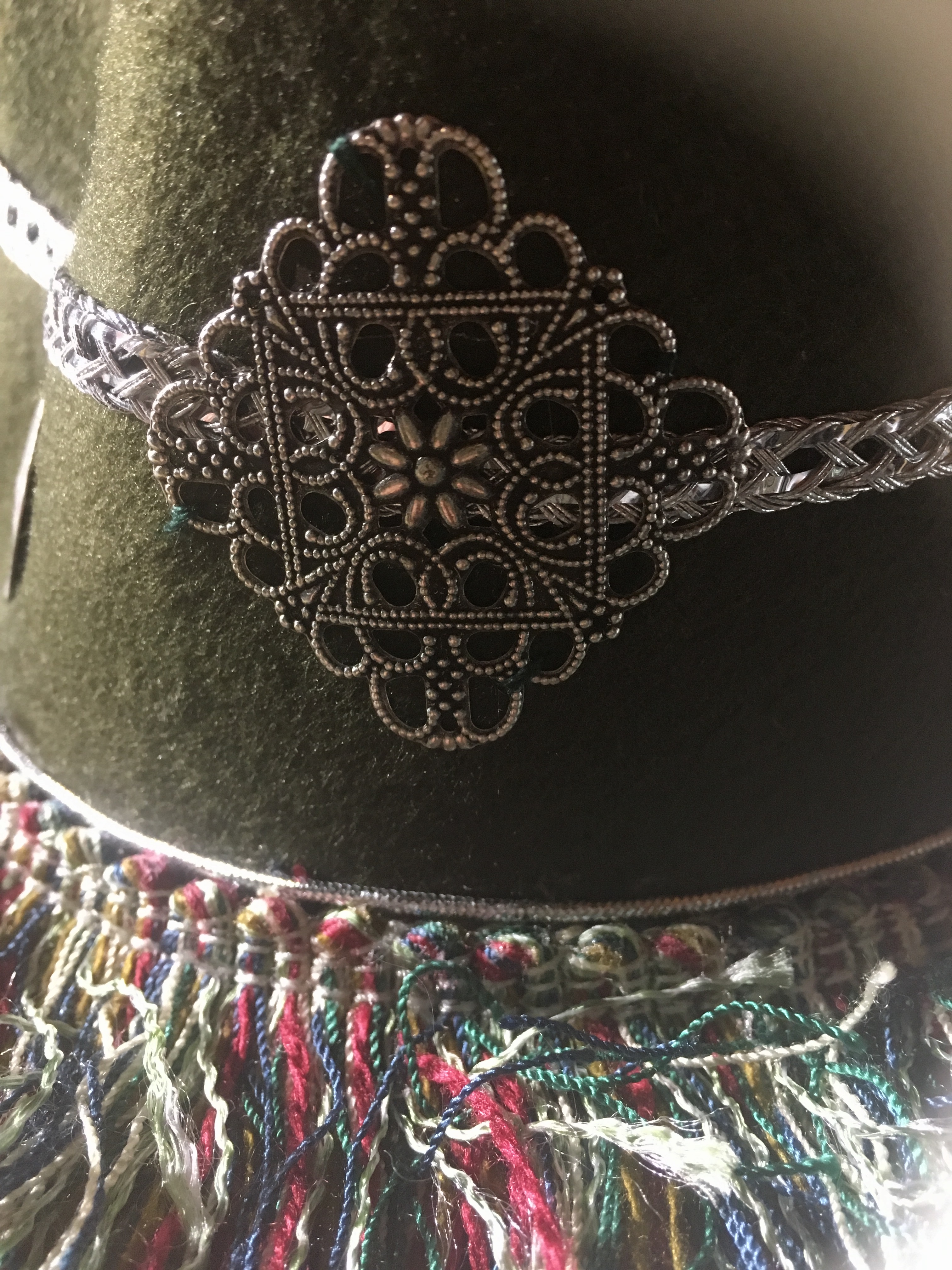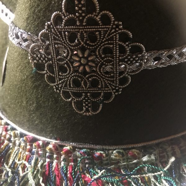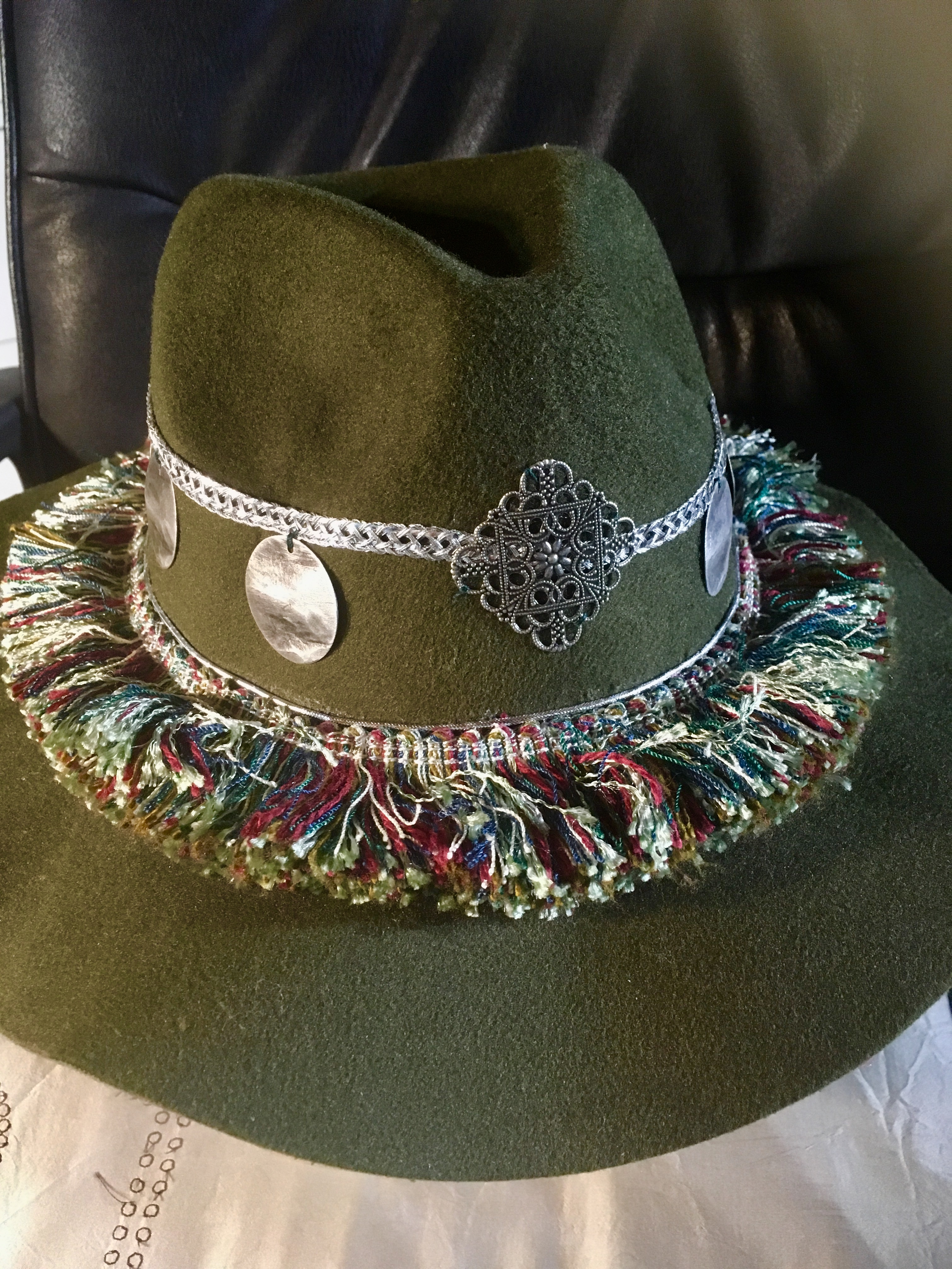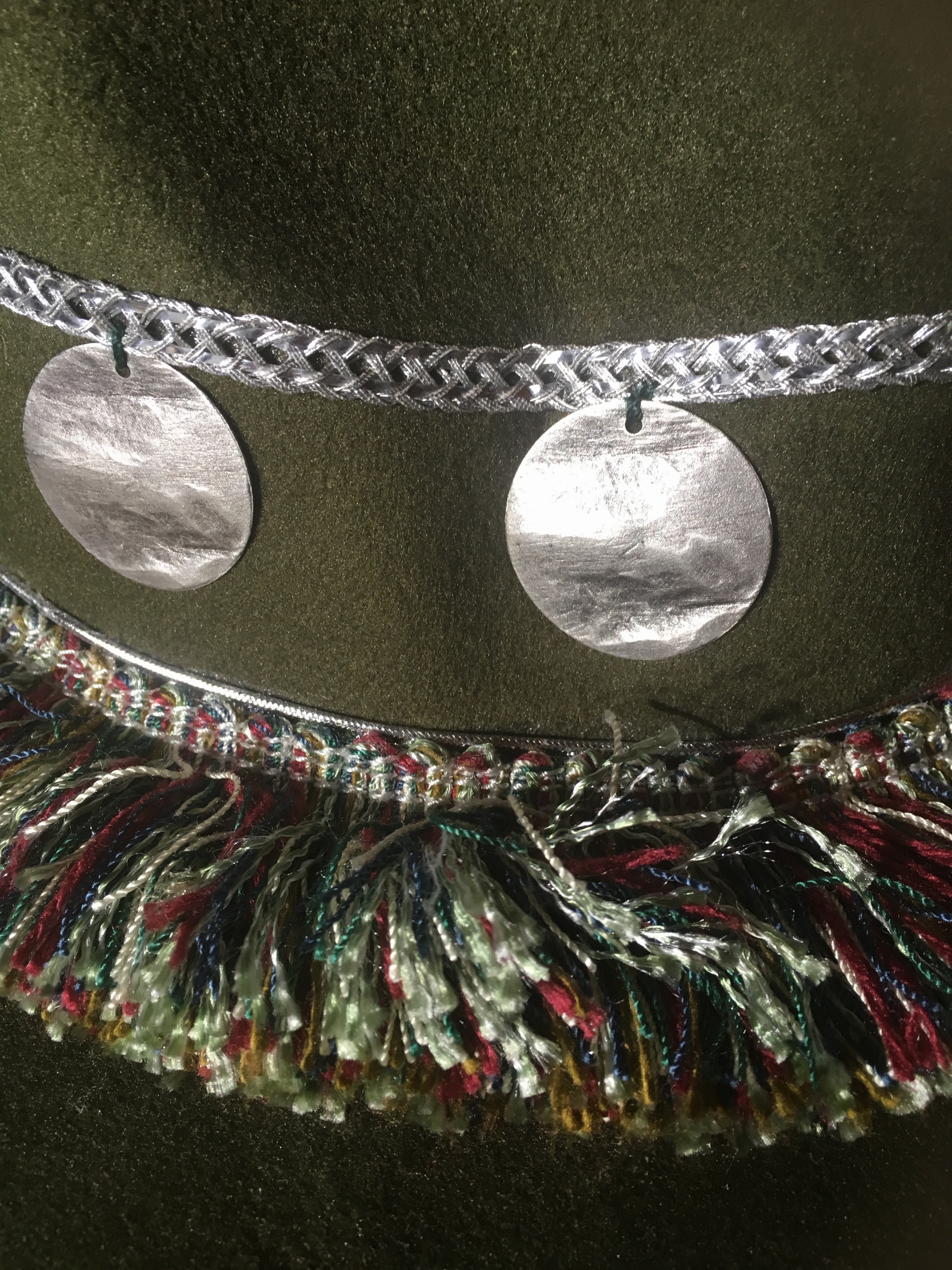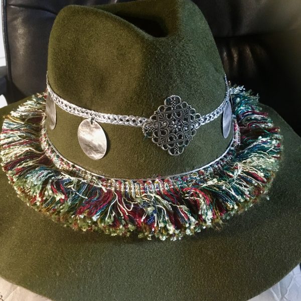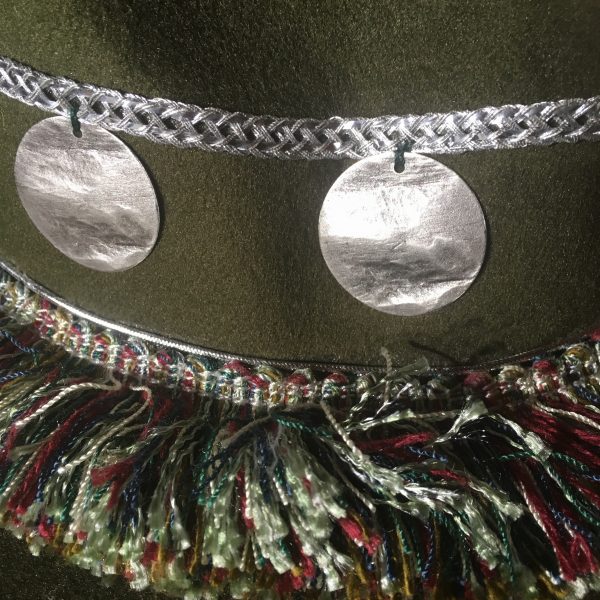 Chapeau en feutre couleur Kaki, agrémenté de franges multicolores vertes, bordeaux et beige, pampilles en métal argenté mat et ruban argenté en décoration.