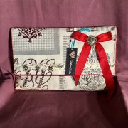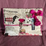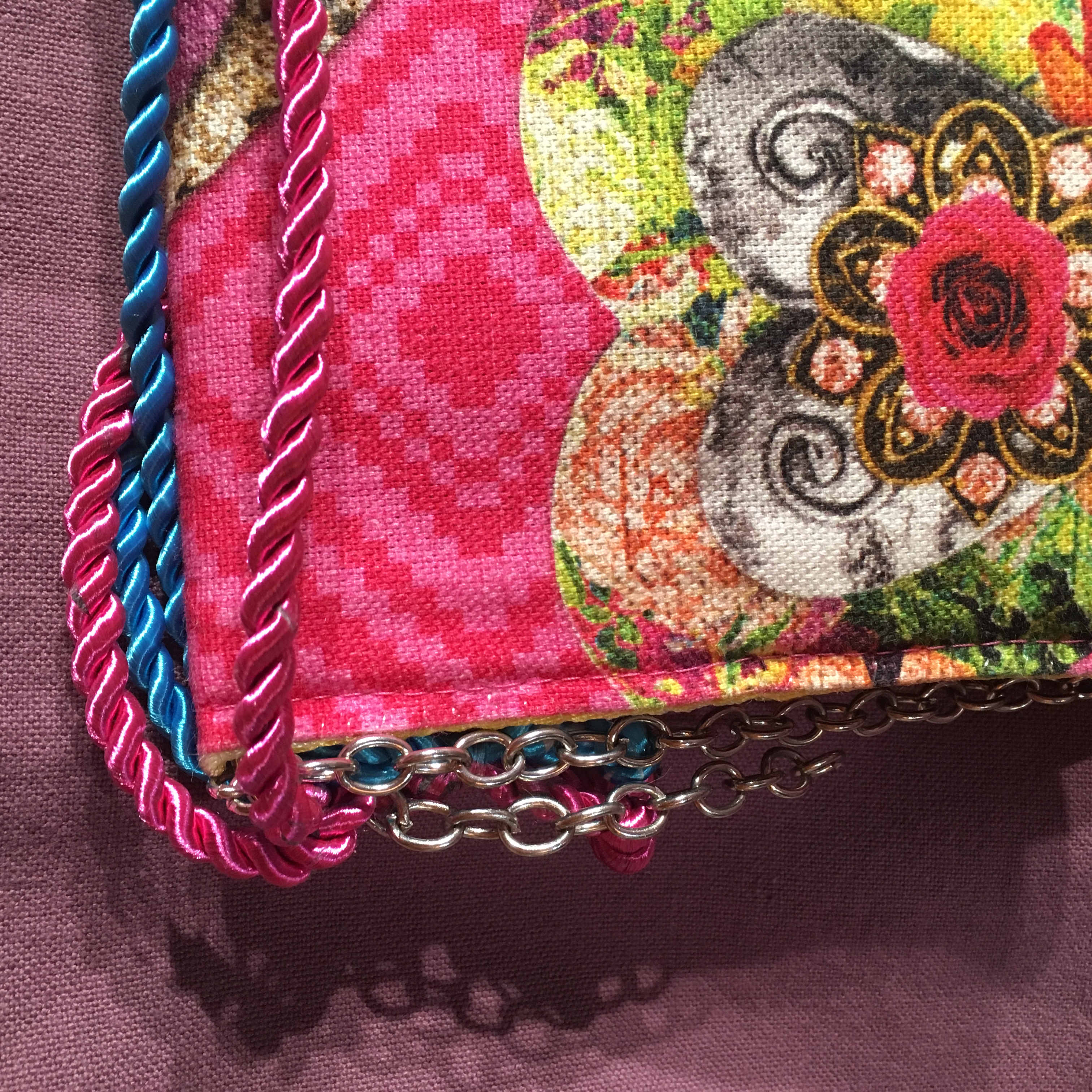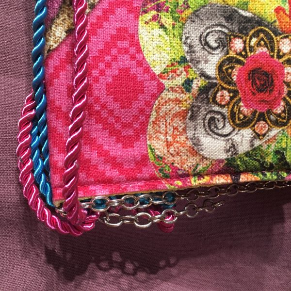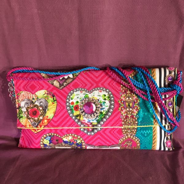 Pochette de format 36 cm X 19 cm, réalisée en tissus de coton. Bandoulière non amovible, entièrement doublée. Fermeture par pression.
