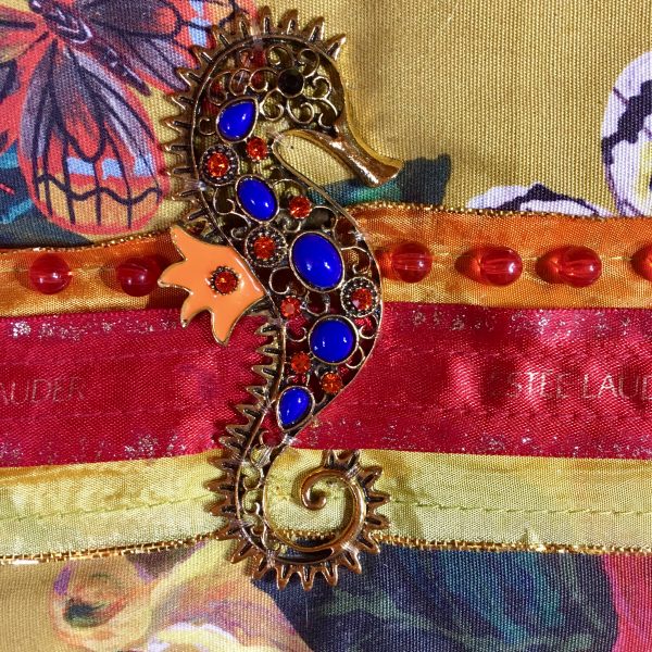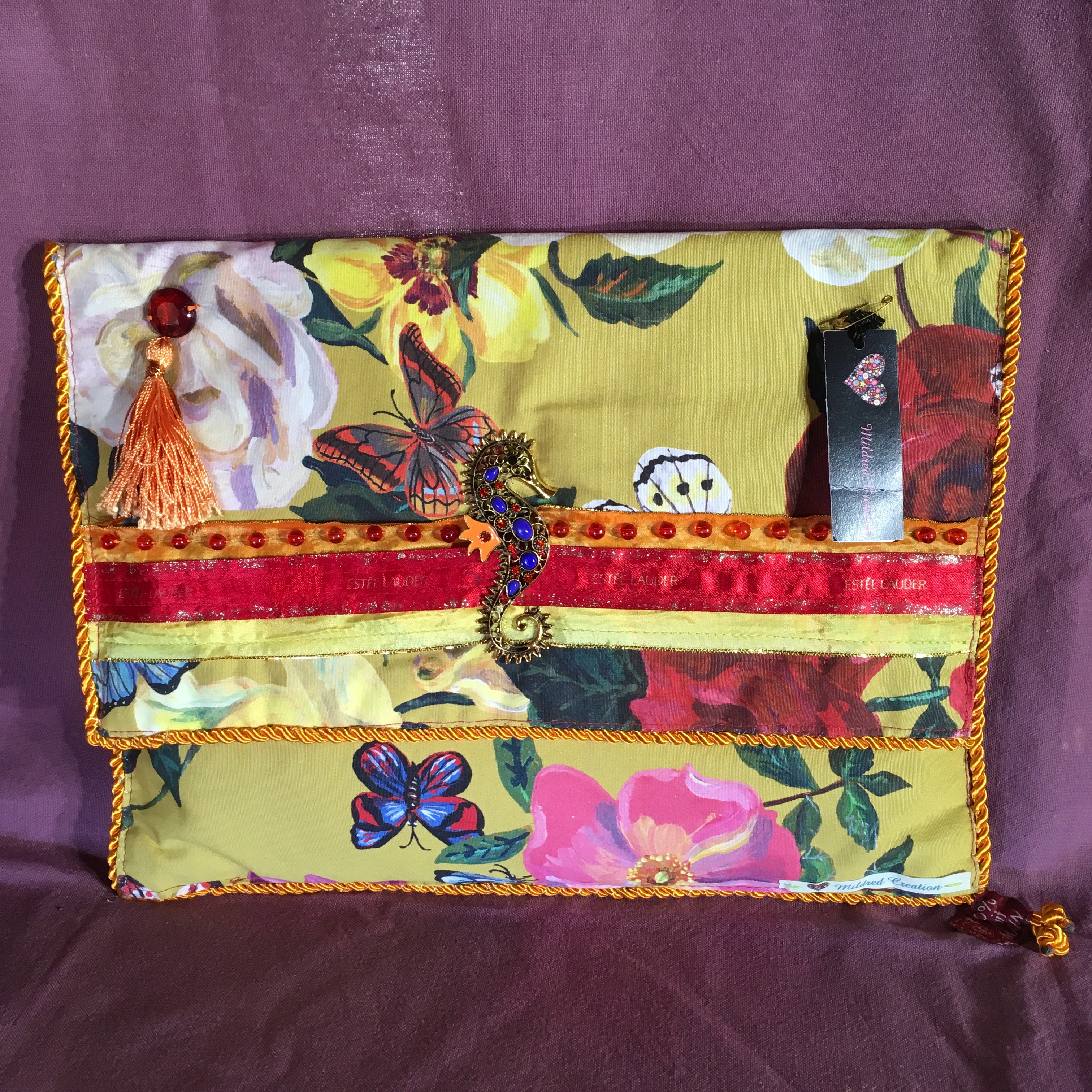 Pochette, ou trousse de toilette réalisée en tissus de coton à motif papillon sur fond jaune, entièrement doublée et décorée de rubans et de perles, incrustation d’un hippocampe en métal argenté et de perles de couleur.