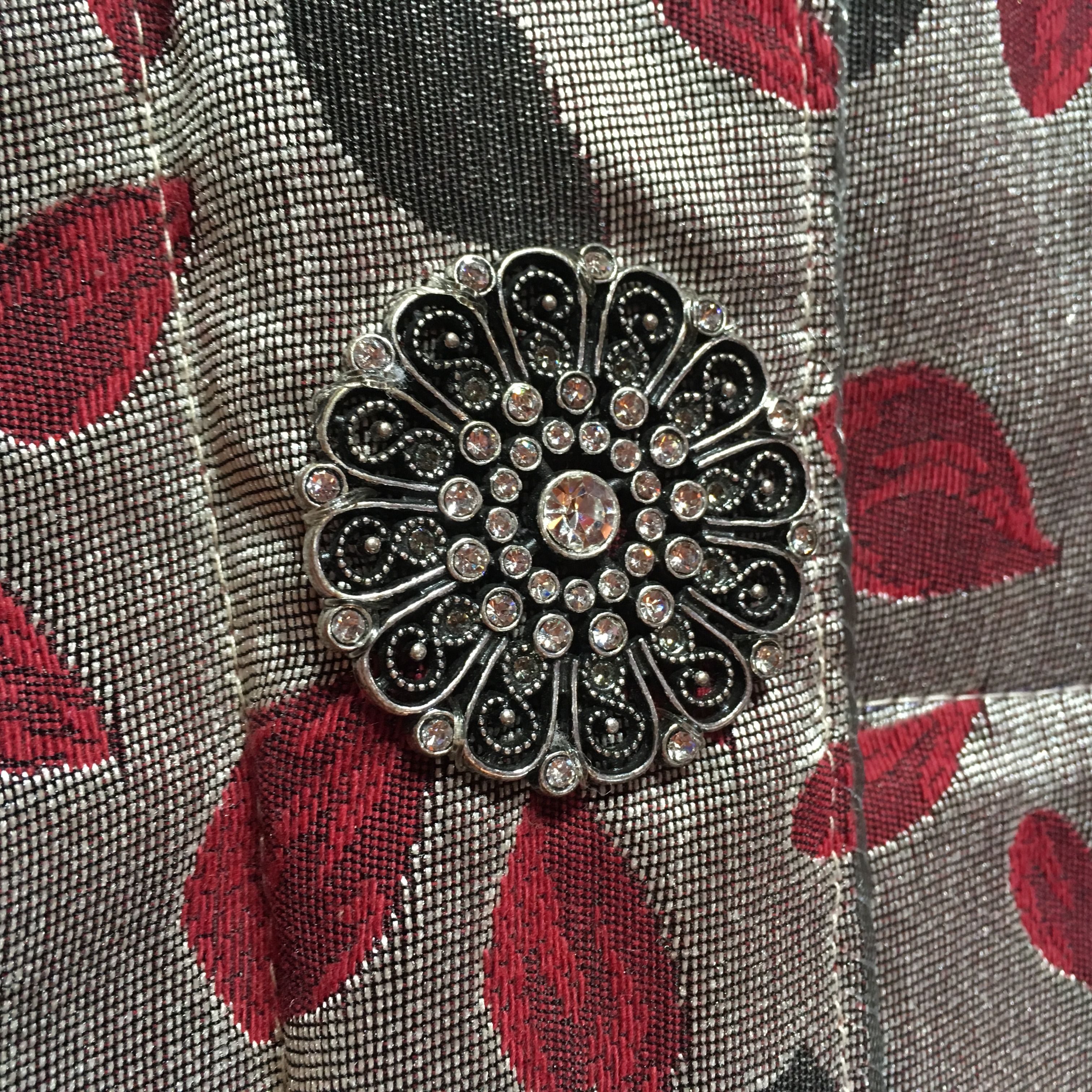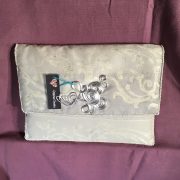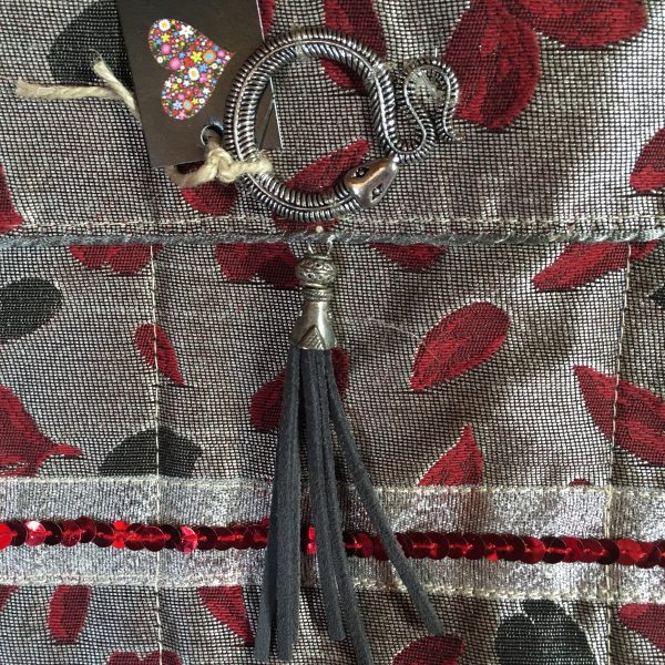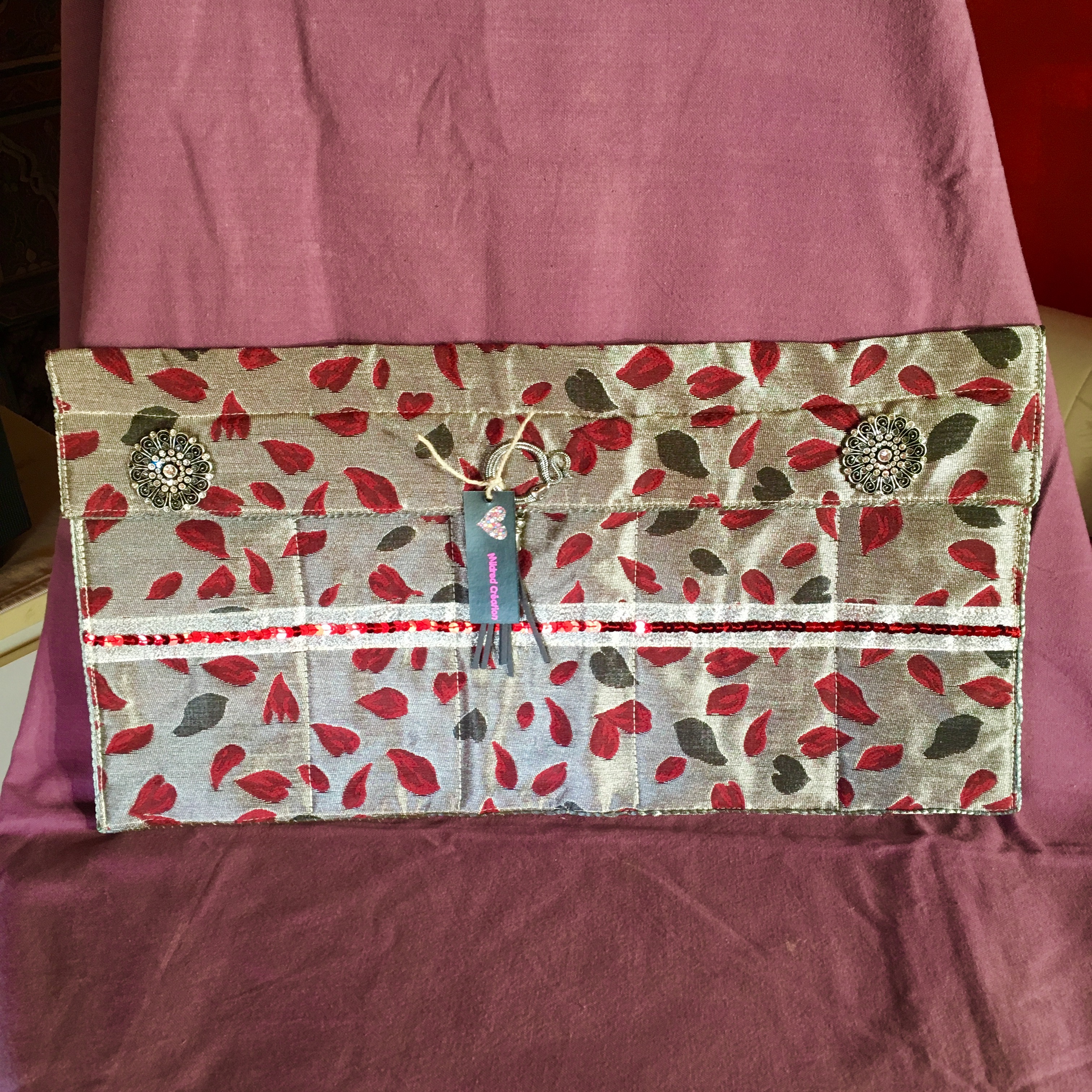 Pochette de rangement a suspendre avec tringle (non inclus). Réalisée en tissus satiné brillant argenté et bordeaux. A accrocher sur un mur ou dans un dressing afin d’y ranger vos secrets. Fermeture par rabat et pressions. Décoration en métal argenté sur le rabat et pompon en cuir.
