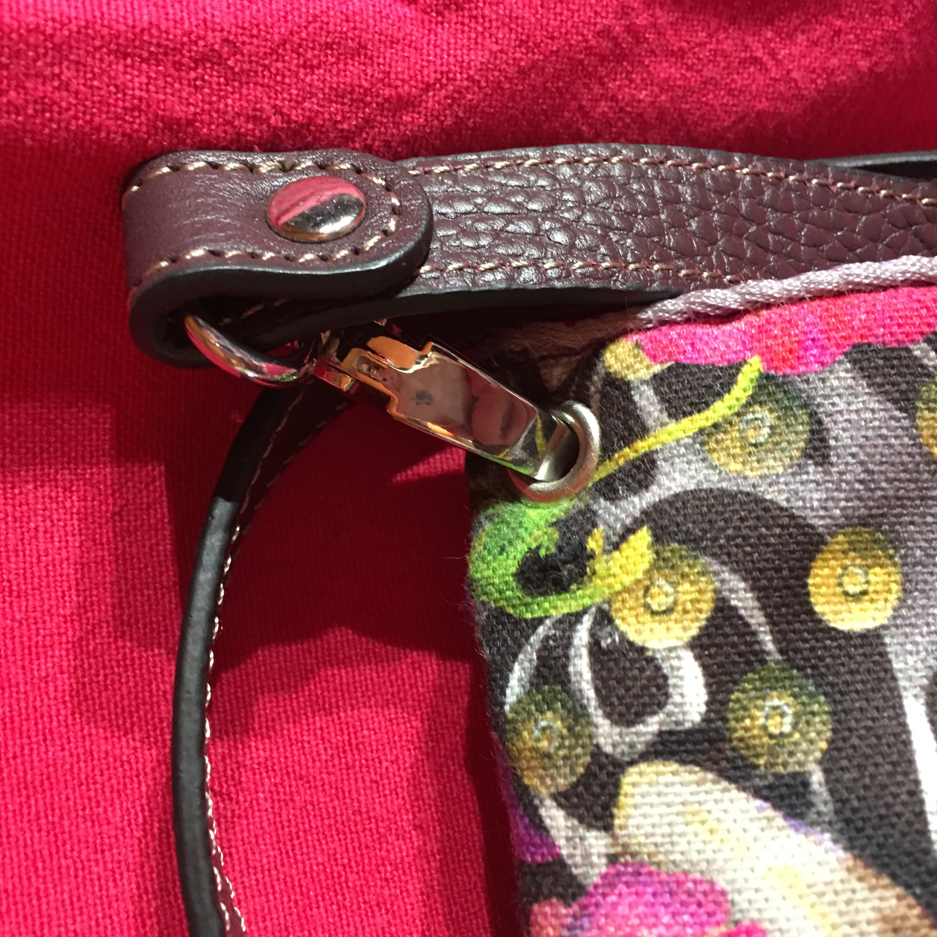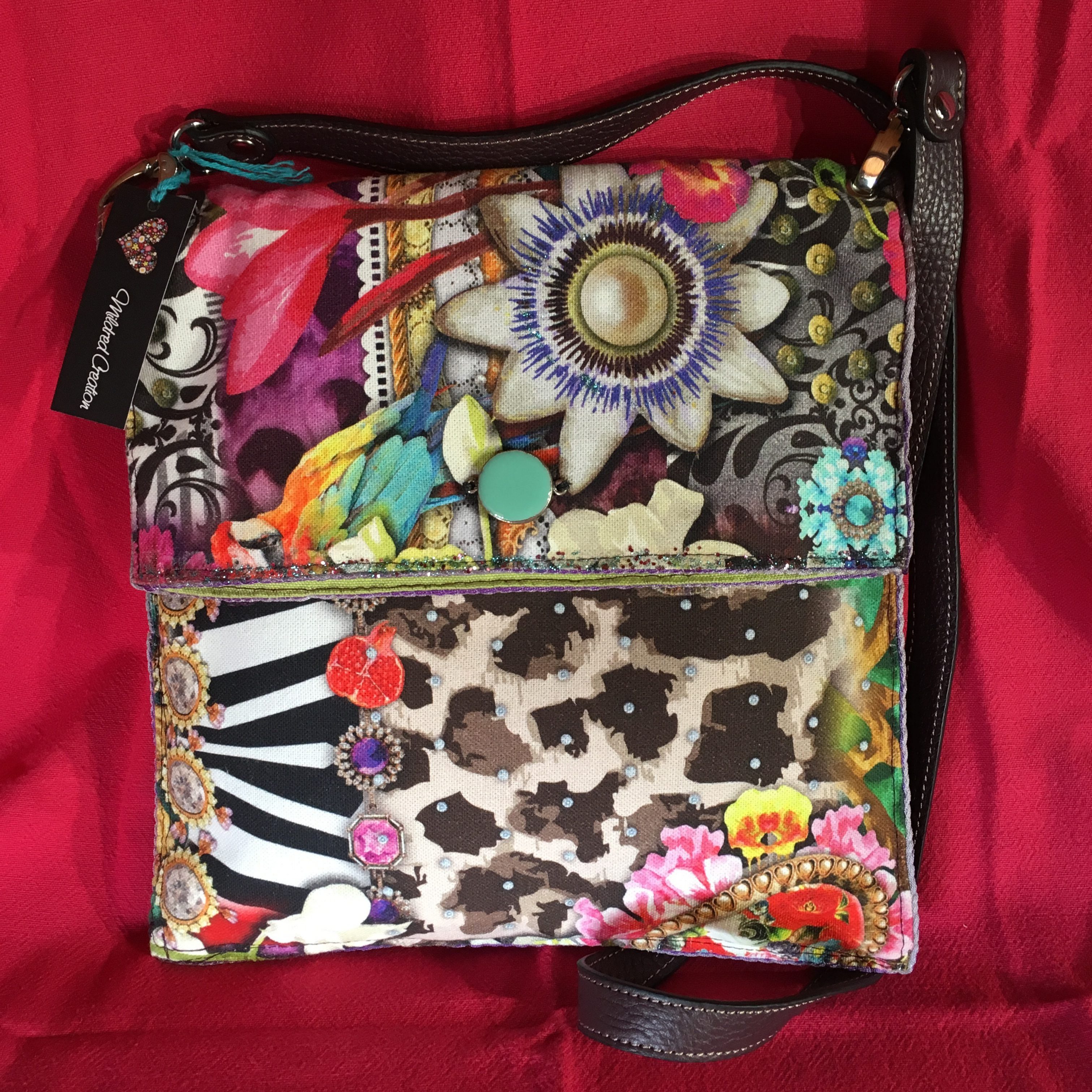 Sac à main de format 26 cm X 26 cm, réalisé en tissus de coton multicolores de marque « méli-mélo ». Fermeture par grand rabat, pression et cabochon décoratif sur le revers en turquoise serti de métal argenté. Bandoulière amovible en cuir couleur prune.
