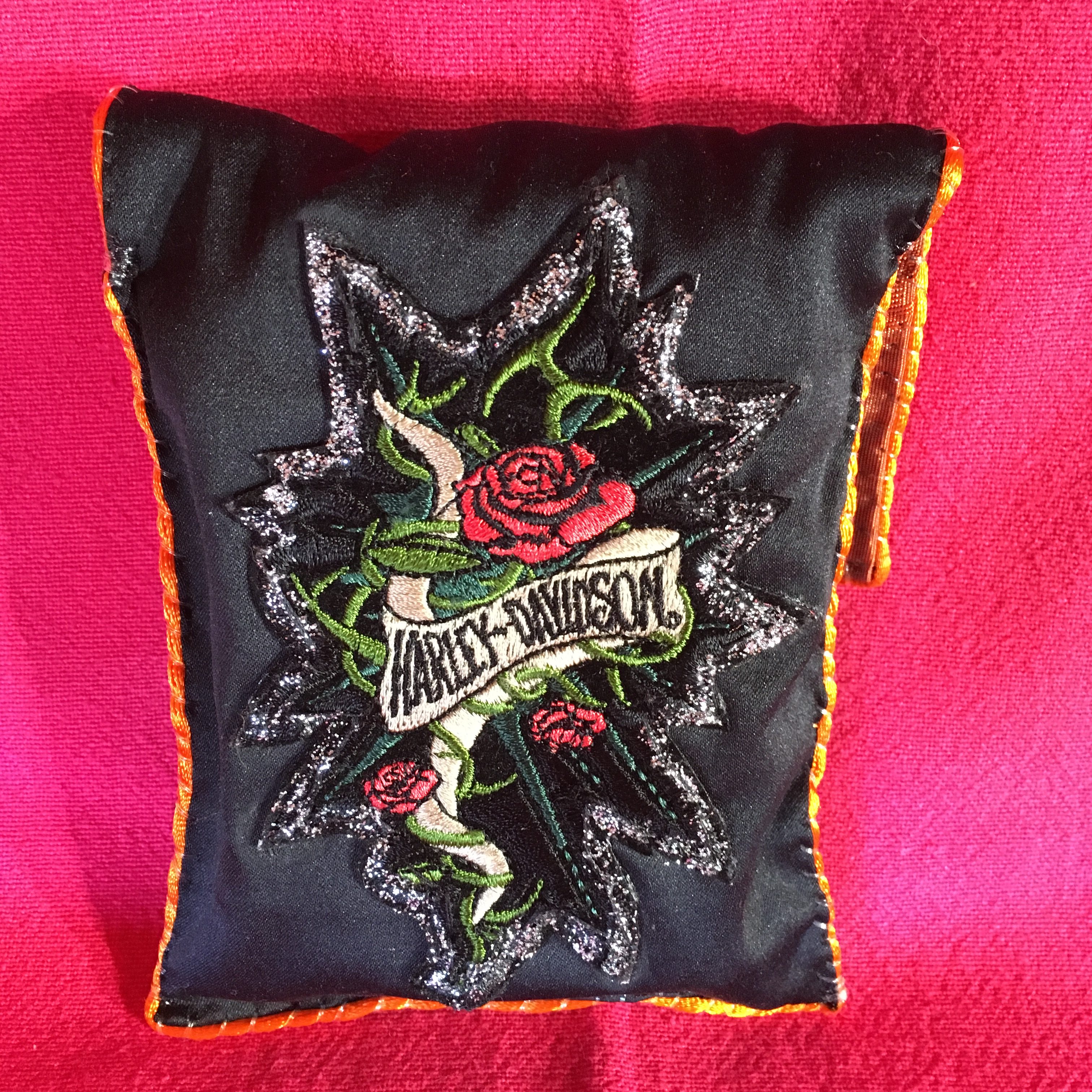 Modèle Harley Davidson, véritable écusson Harley Davidson, agrémenté de strass, et de perles . Au dos écusson Harley Davidson cousu main. Réalisée en tissus de soie noir satiné. Fermeture par pression. Entièrement doublé.