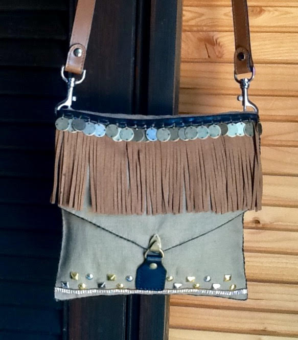 pochette à bandoulière lin, clous et franges , Style Ethnique.