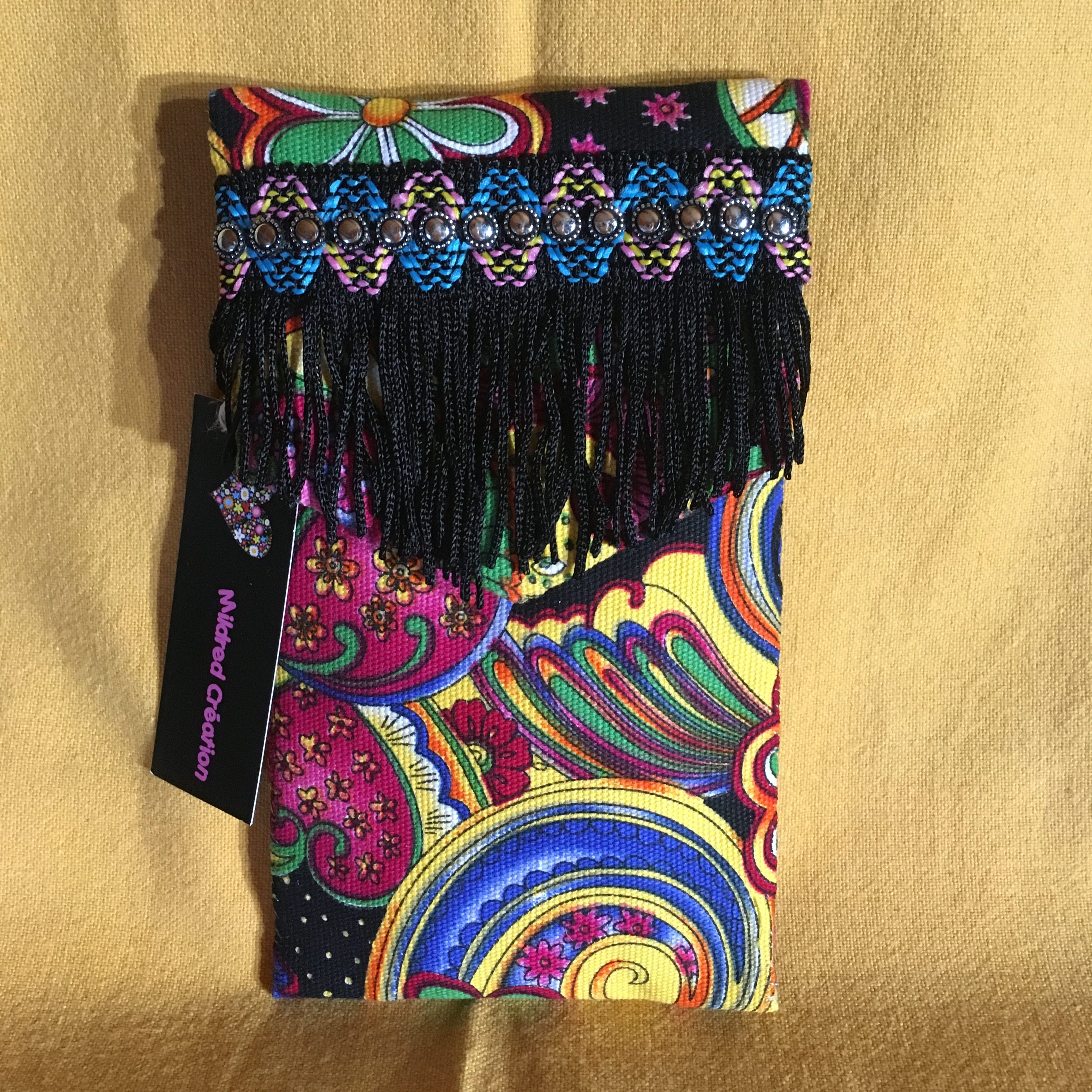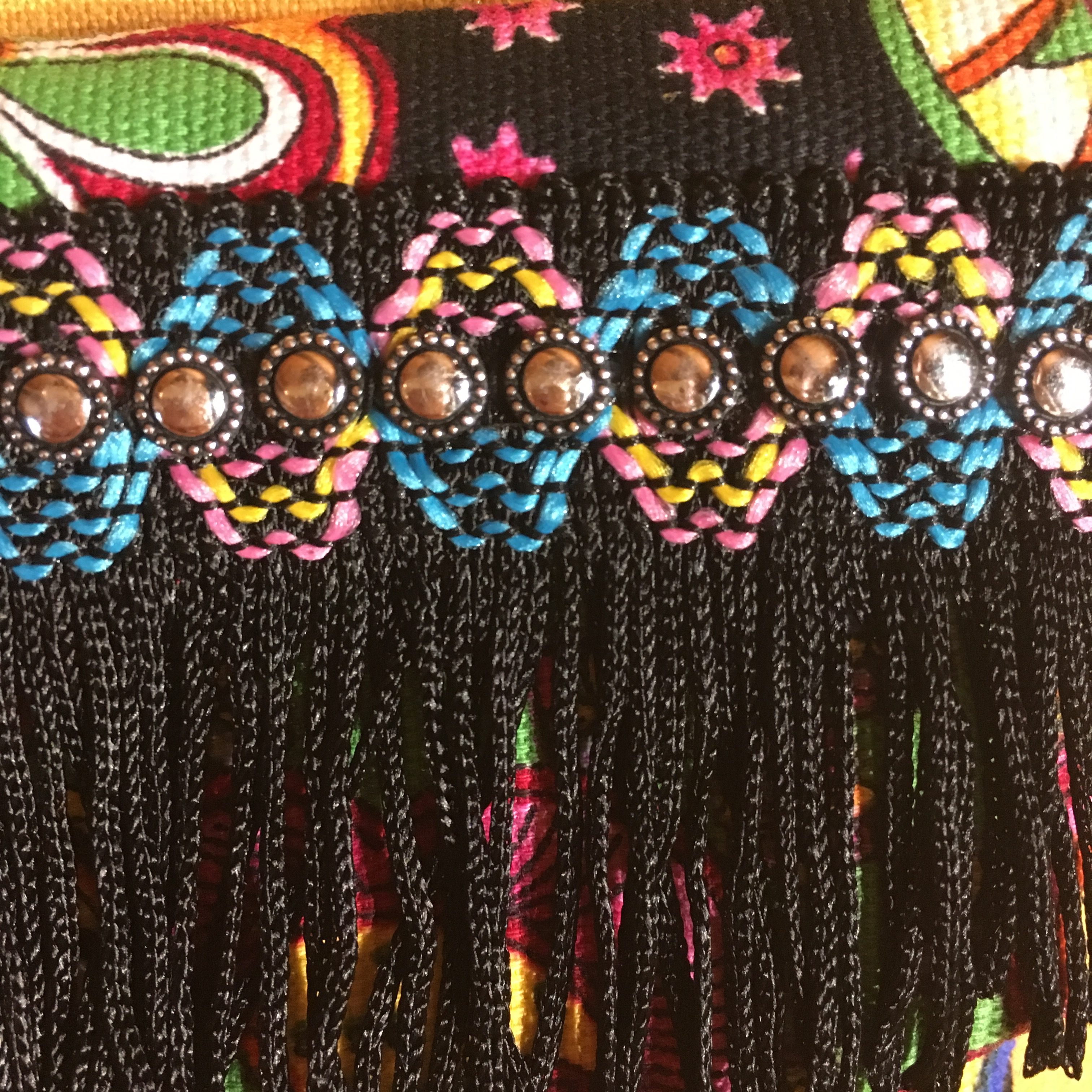 Pochette réalisée en tissus de coton motifs multicolores, entièrement doublée, fermeture par pression. Décorée par un galon tressé et longues franges noires sur la face avant, petit rang de clous sur la partie haute.