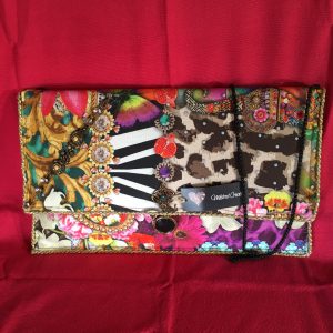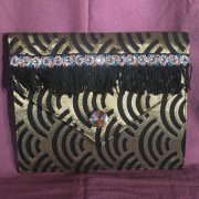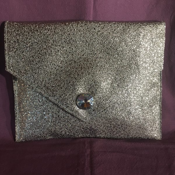 Pochette pour IPAD, réalisé en tissus PVC OR, entièrement doublée en lin beige, agrémentée d’un cabochon diamant sur le rabat. Format 30 cm X 25 cm. Fermeture par velcro.