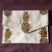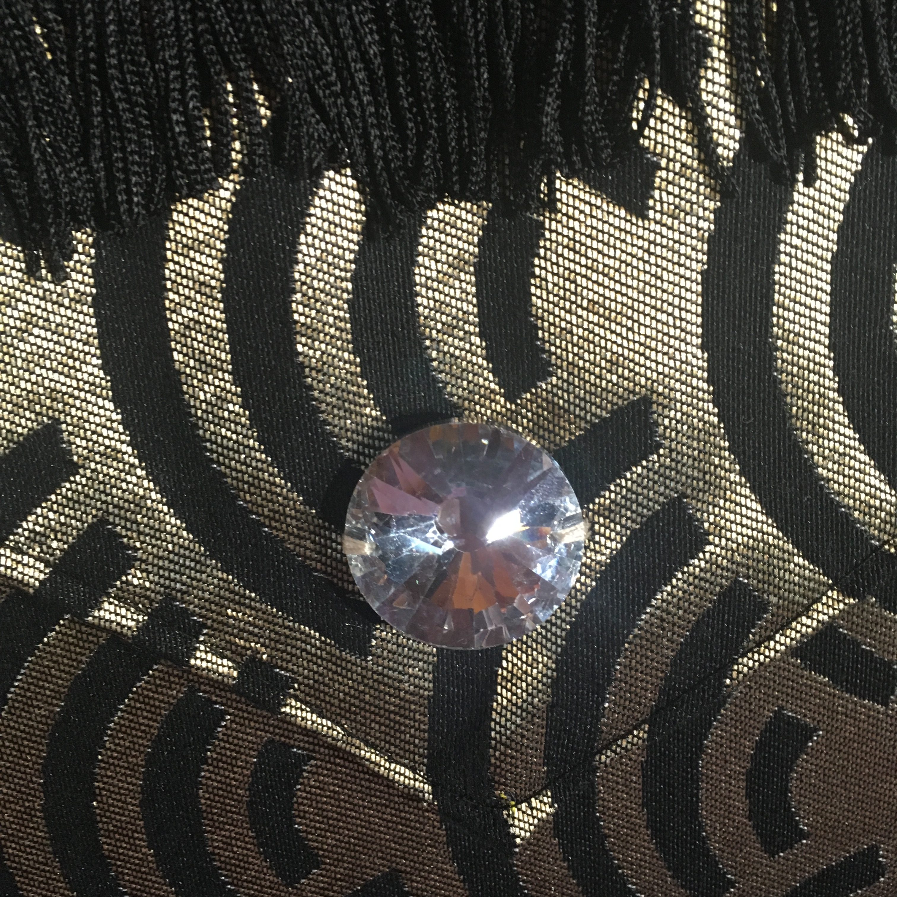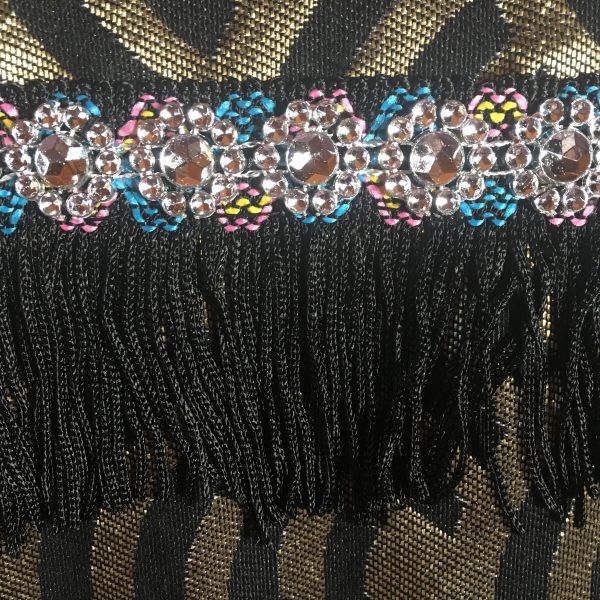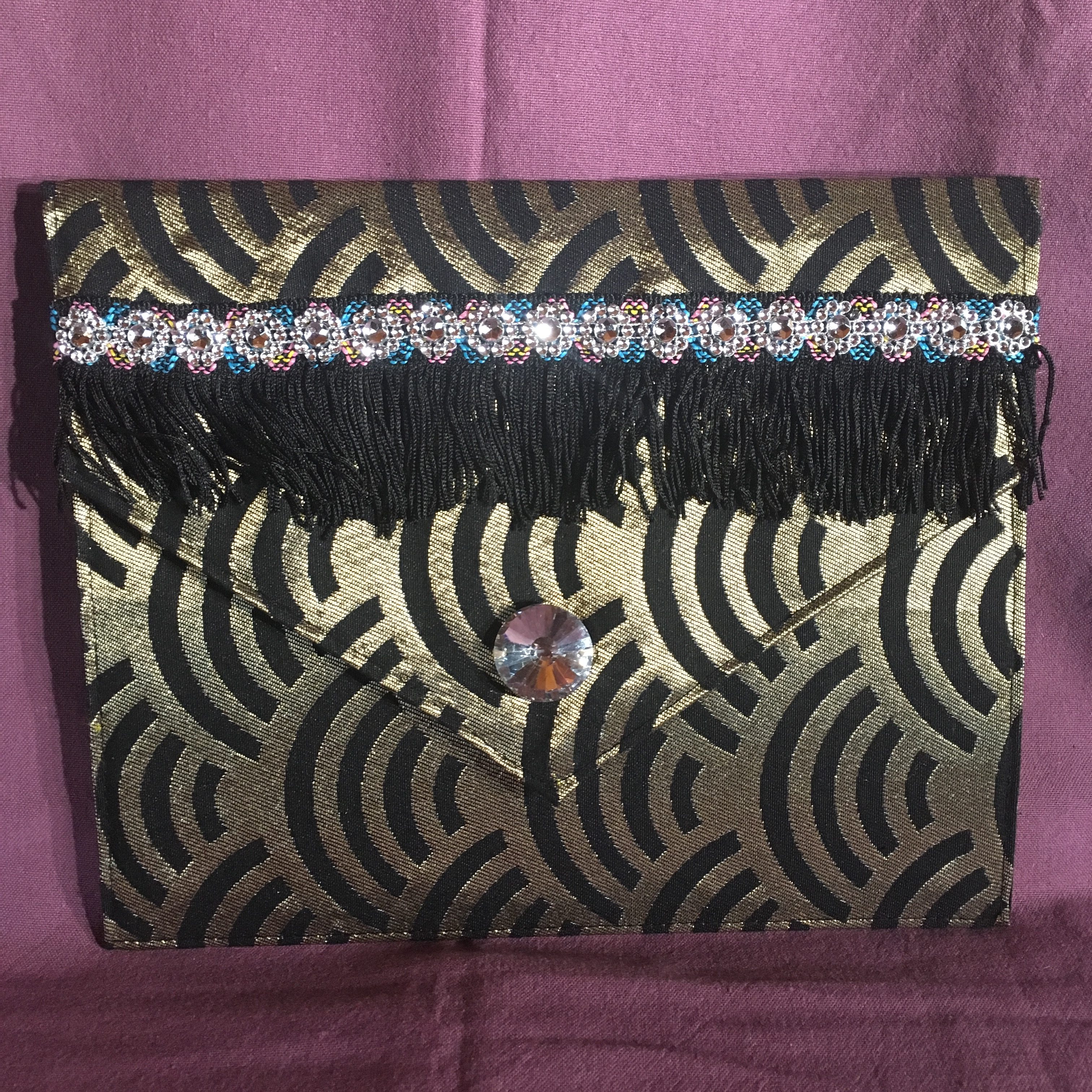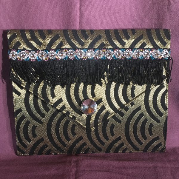 Pochette pour IPAD, réalisé en tissus polyester noir et mordoré, entièrement doublée en lin noir, agrémentée d’un ruban de franges noires et d’un cabochon diamant sur le rabat. Format 30 cm X 25 cm. Fermeture par velcro.
