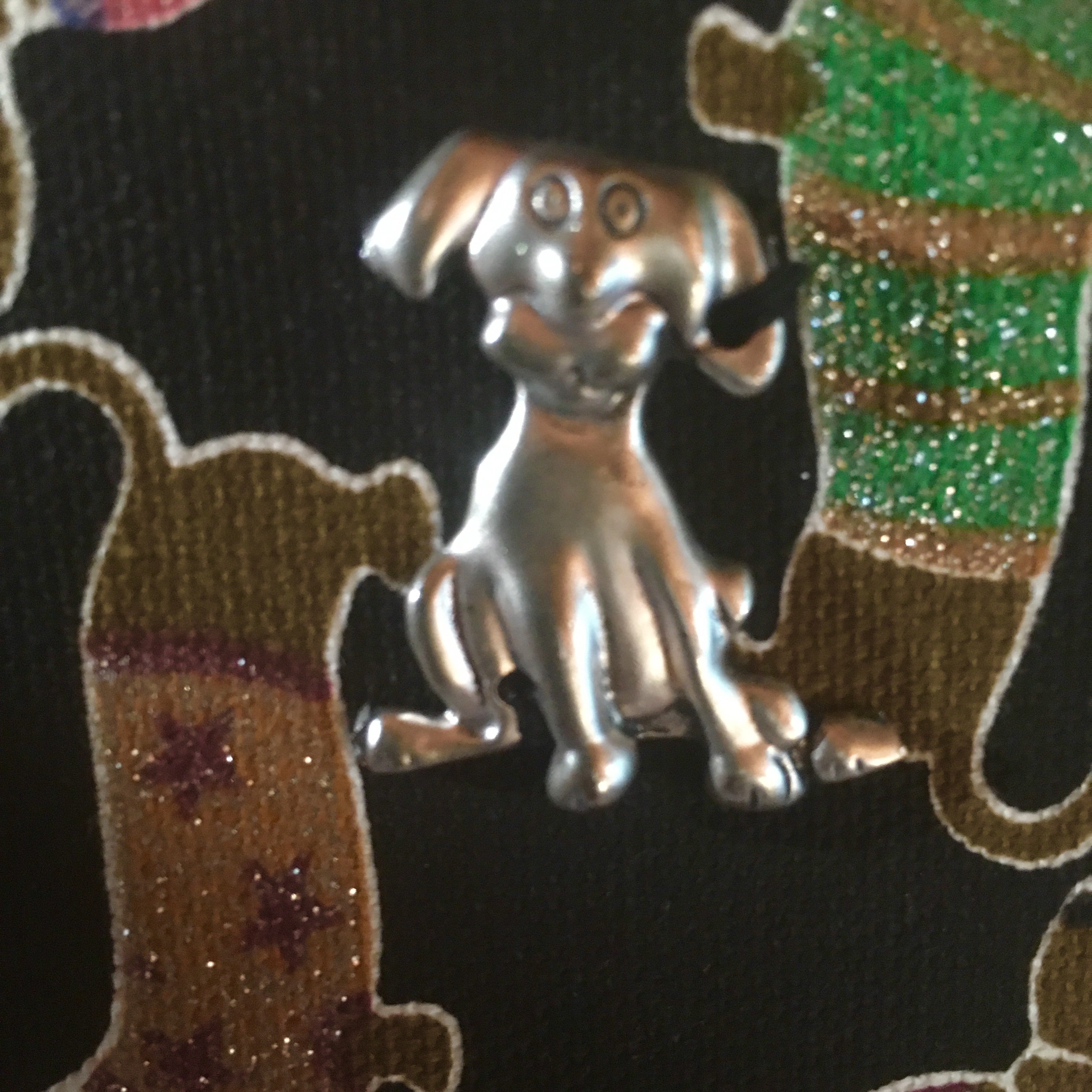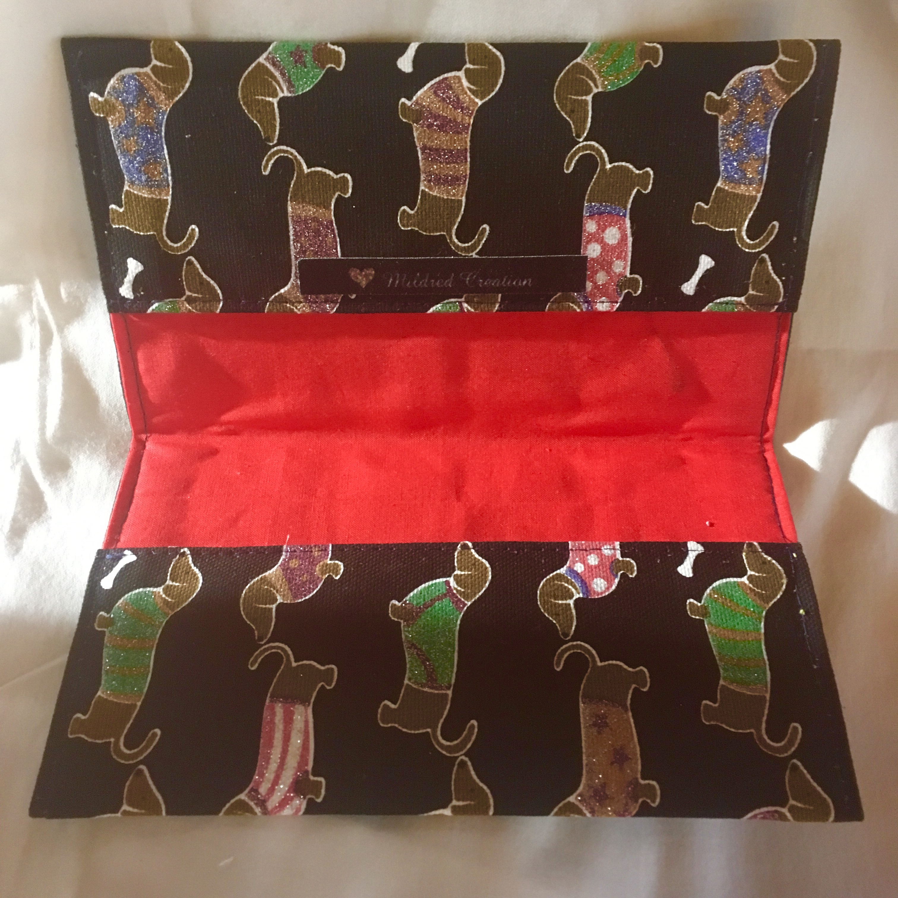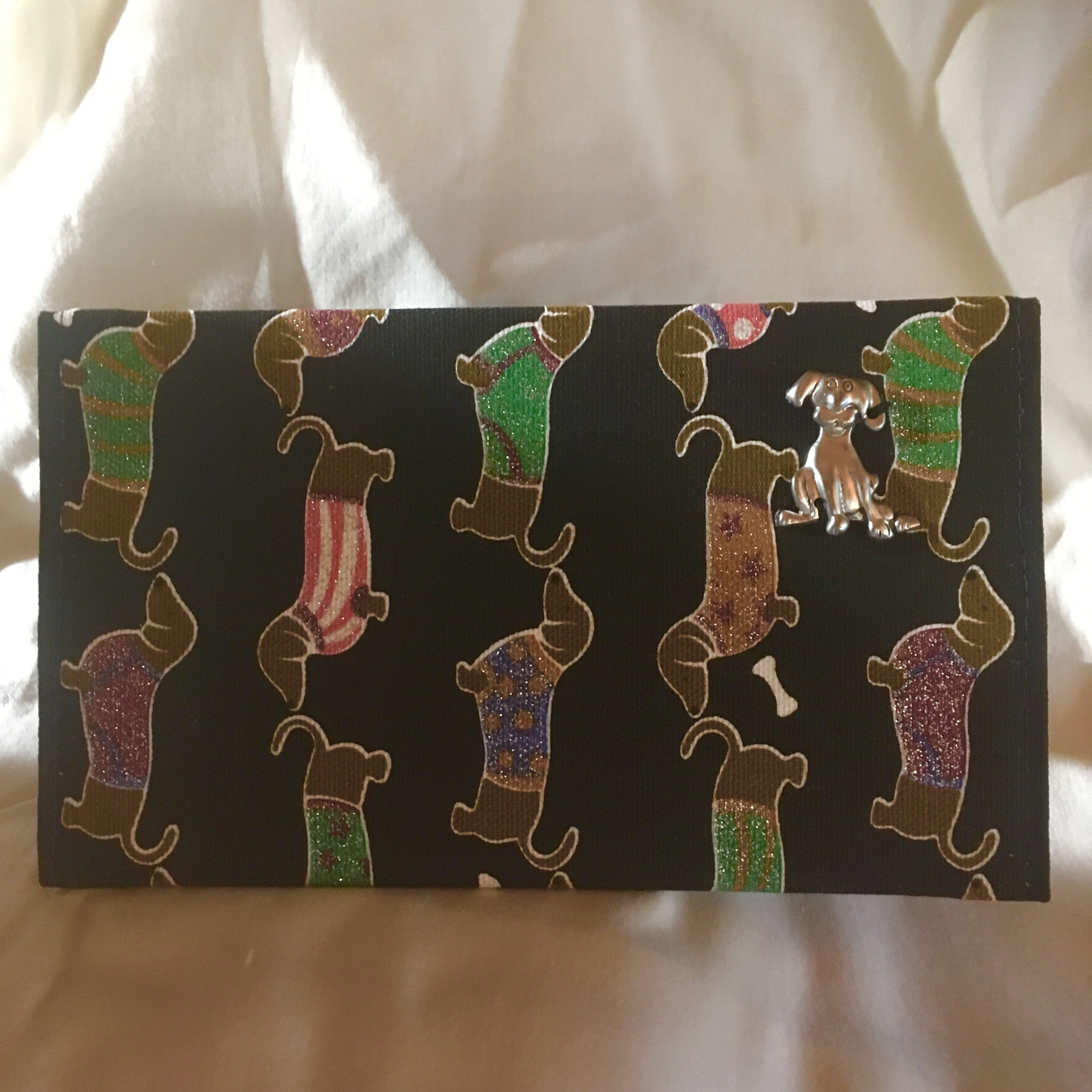 Etui pour carnet de chèque taille standard, réalisé en tissu de coton motif chien teckel, entièrement doublé, cabochon en métal argenté sur le rabat en décoration.