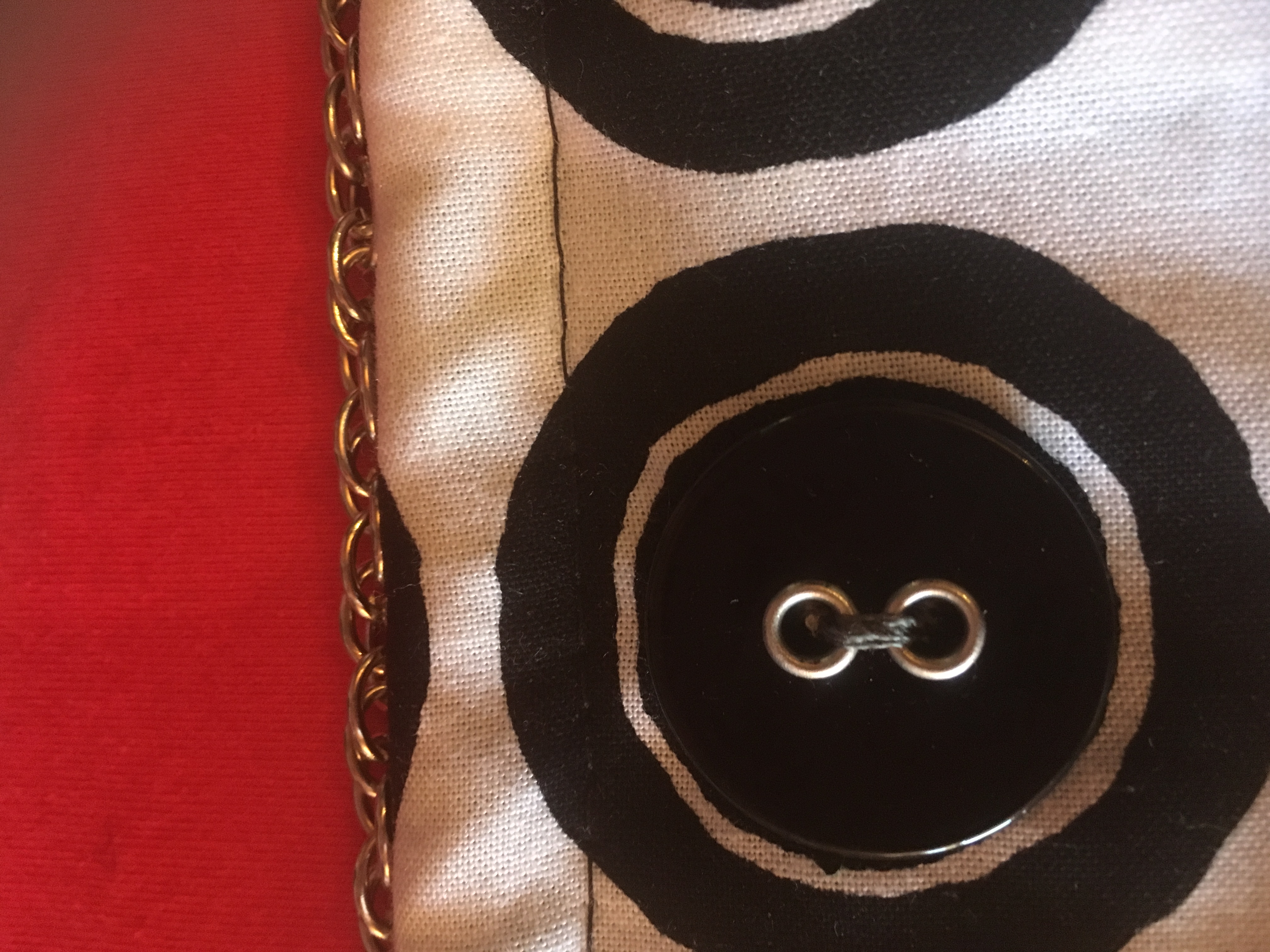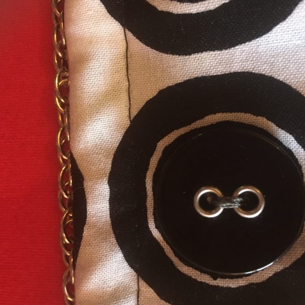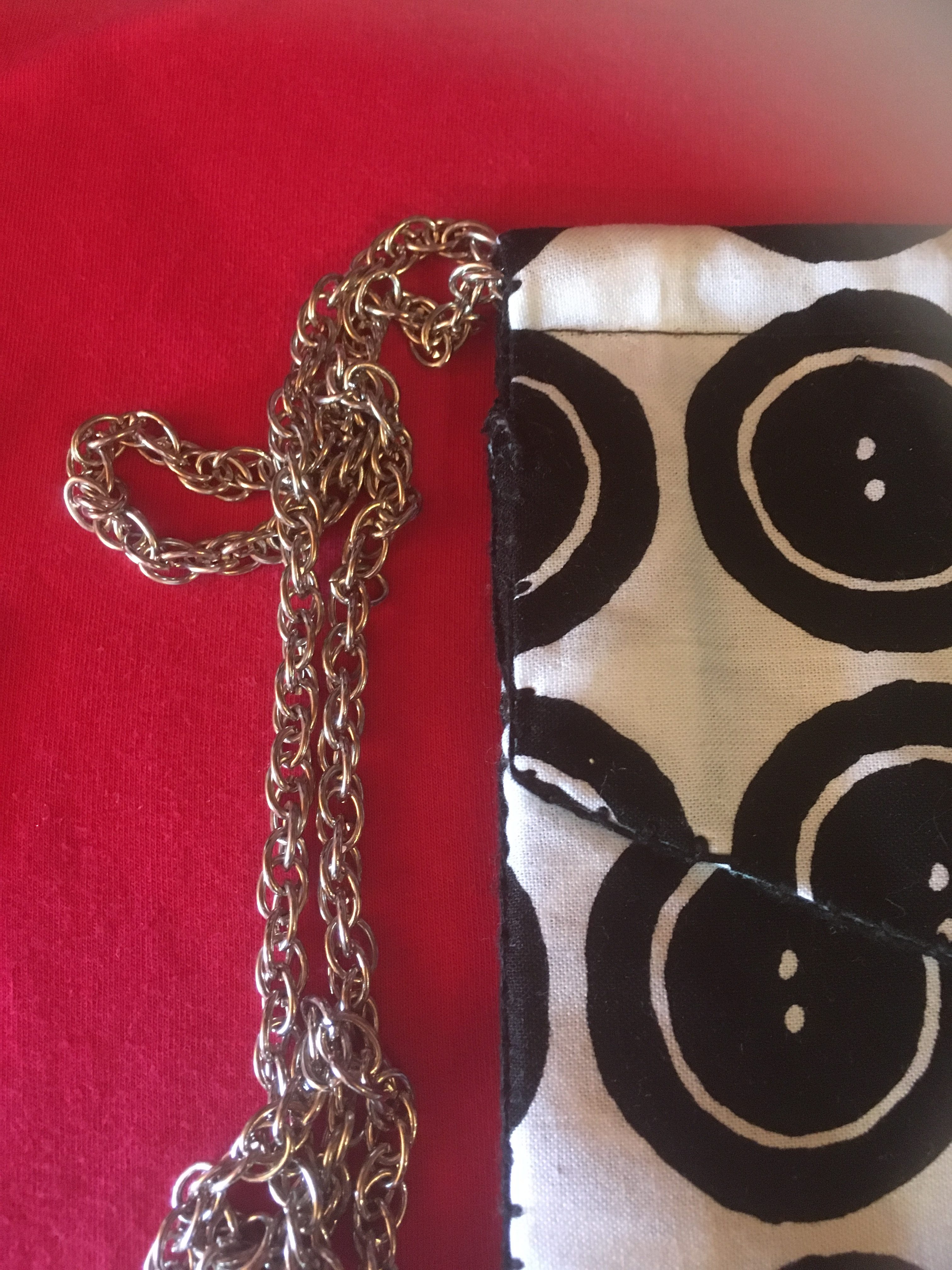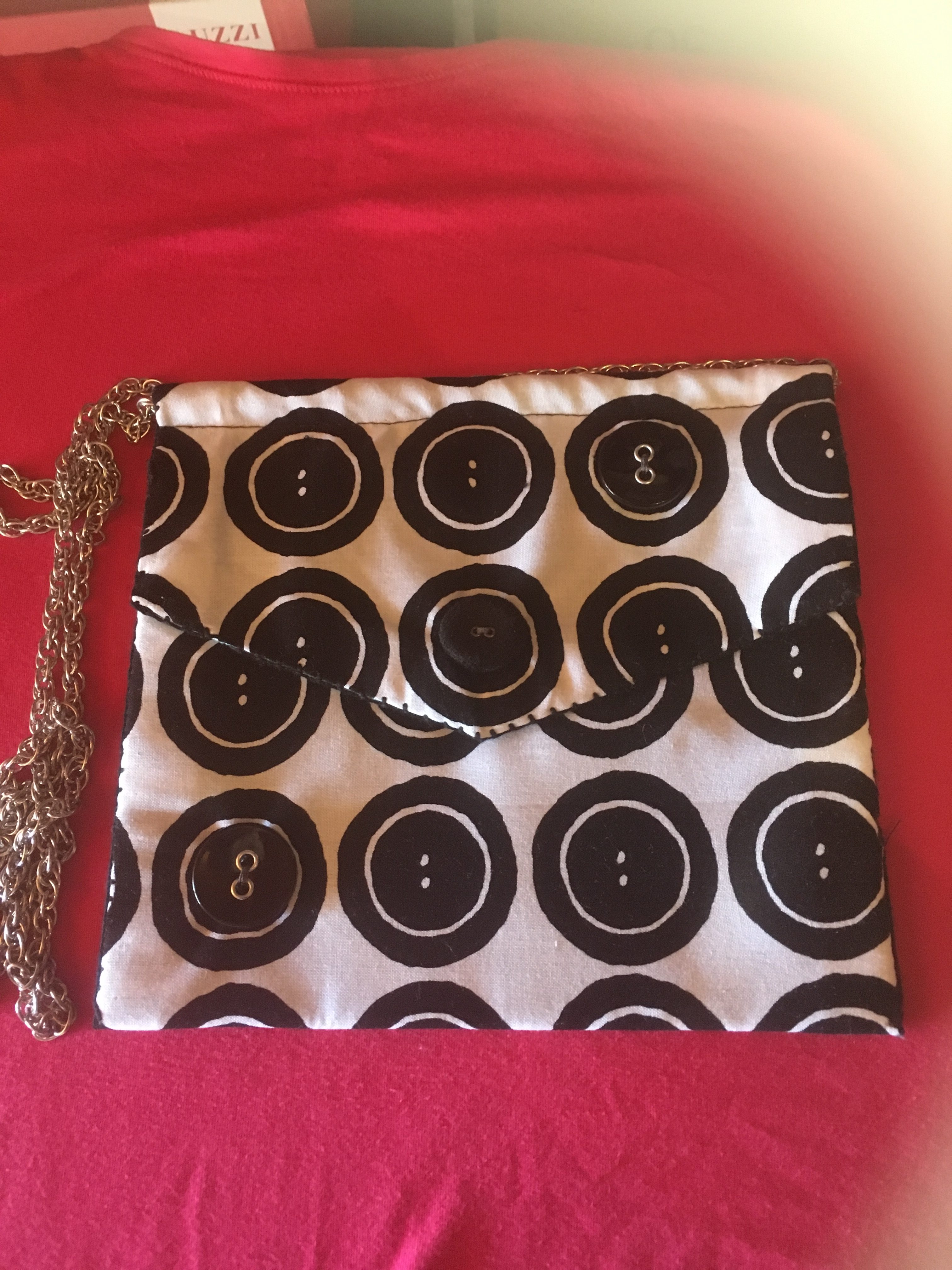 ¨PETITE POCHETTE EN TISSUS MOTIF BOUTONS NOIR ET BLANC BANDOULIERE EN CHAINETTE ACIER FERMETURE PAR PRESSION DECORATIONS VERITABLES BOUTONS SUR LA FACE AVANT