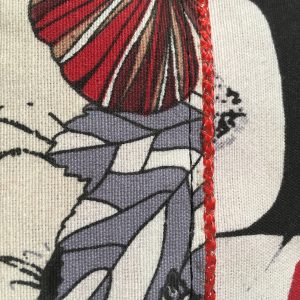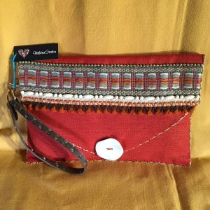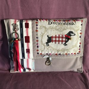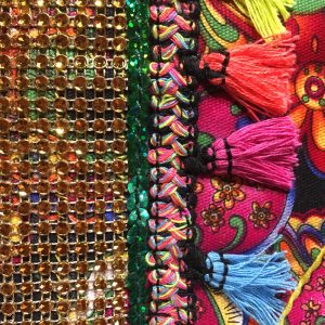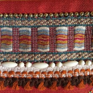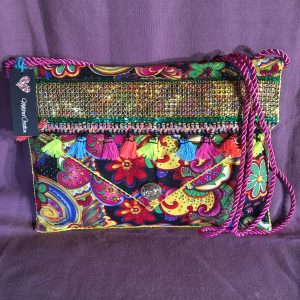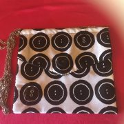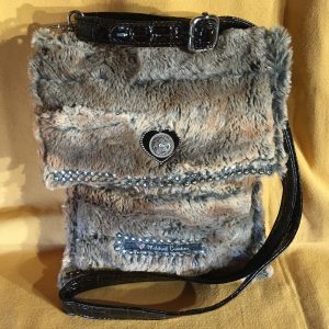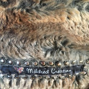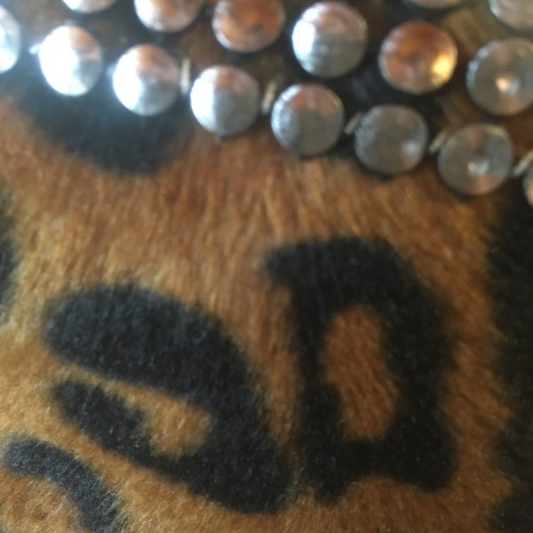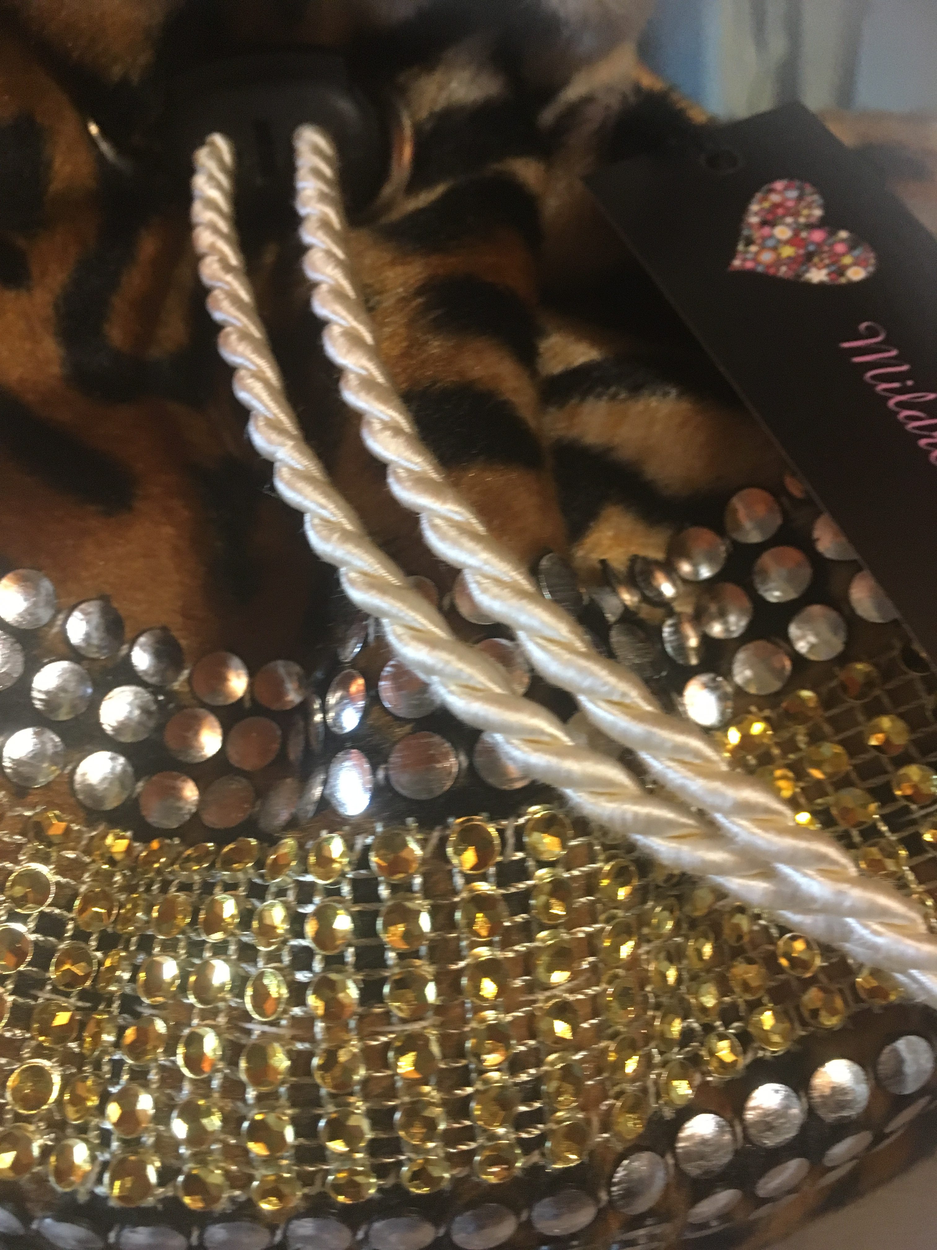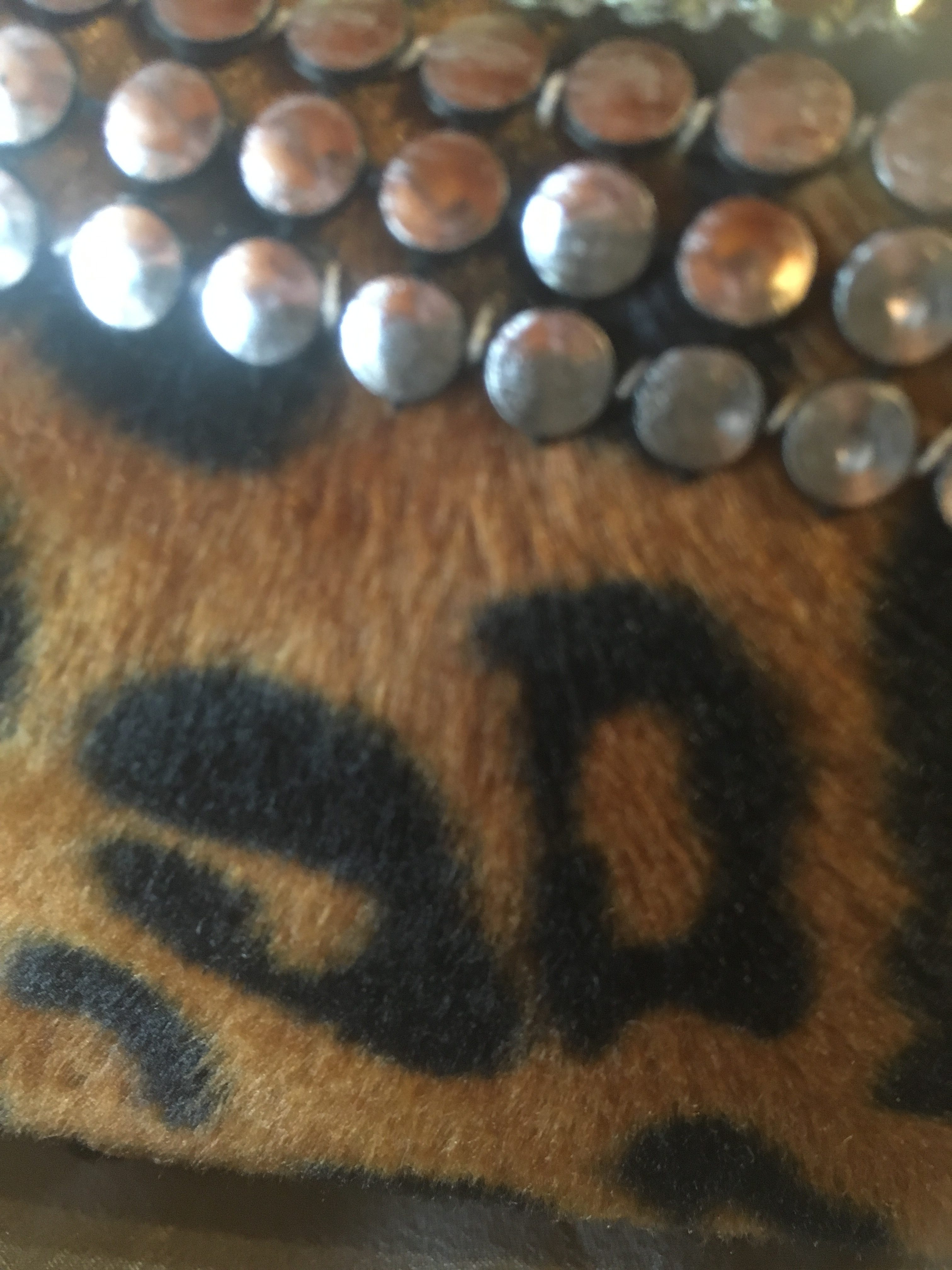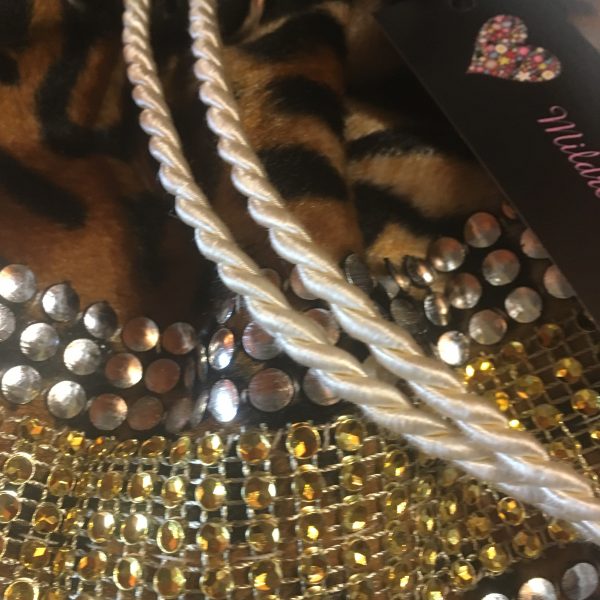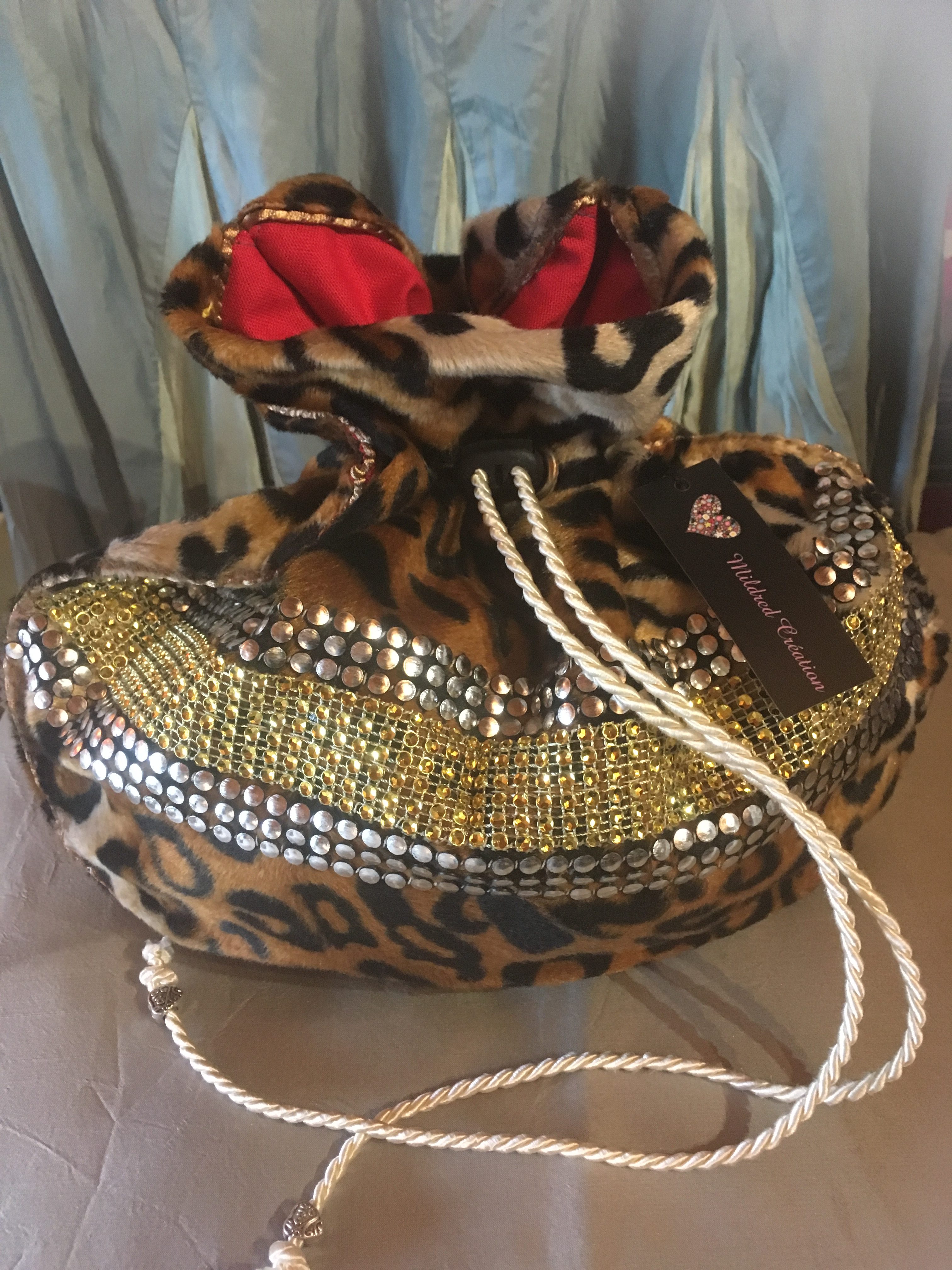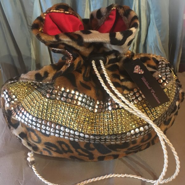 POCHETTE RONDE EN TISSU POILU MOTIF PANTHÈRE SERRAGE PAR CORDONS DOUBLEE AGREMENTEE DE STRASS DORES ET DE RUBANS DE CLOUS ARGENTES
